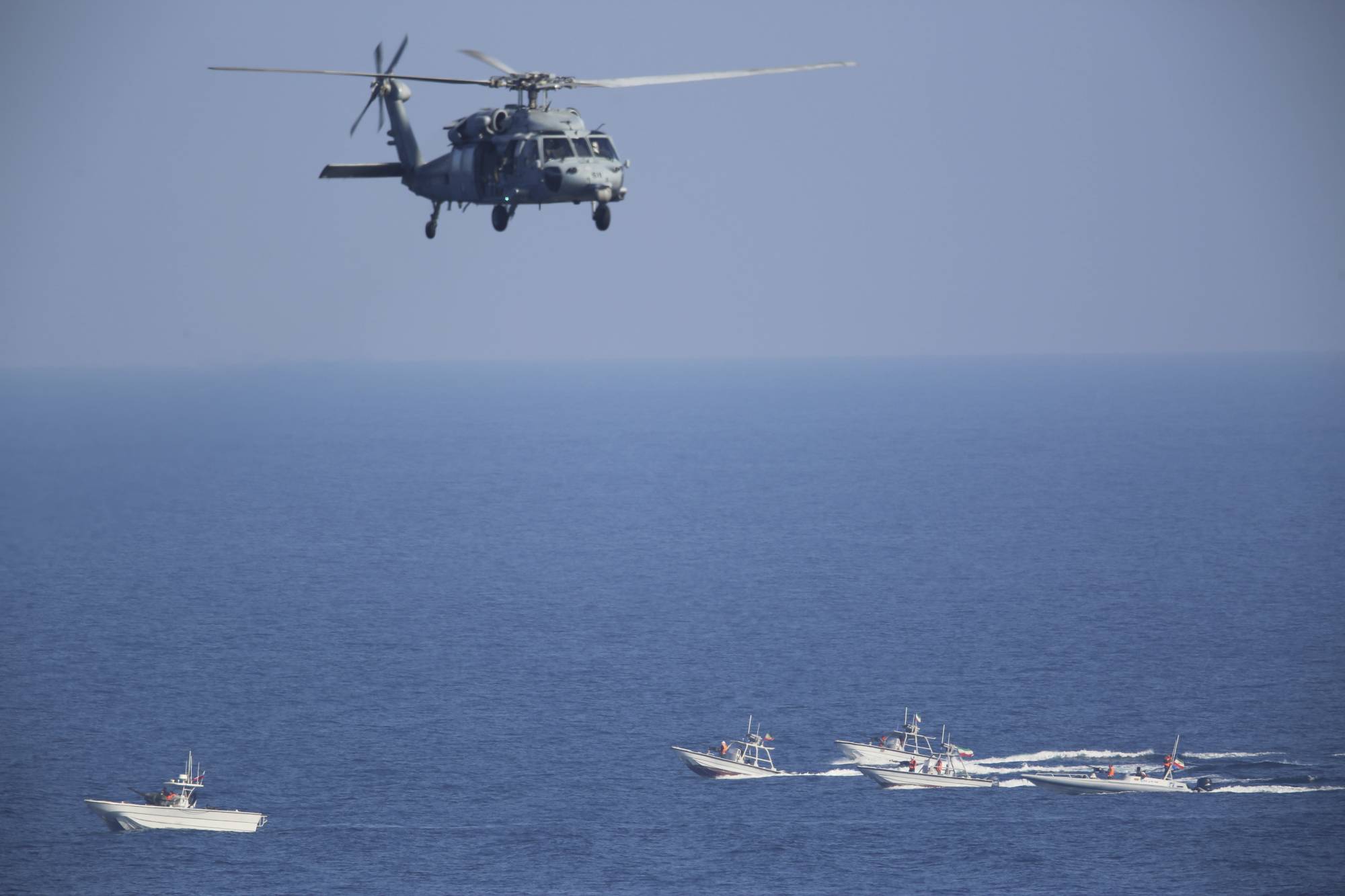 مروحية أميركية من طراز «بايف هوك إتش إتش 60 - ج» تُحلق فوق زوارق دورية تابعة لـ«الحرس الثوري» الإيراني في مضيق هرمز خلال ديسمبر 2018 (أرشيفية - أ.ب)
