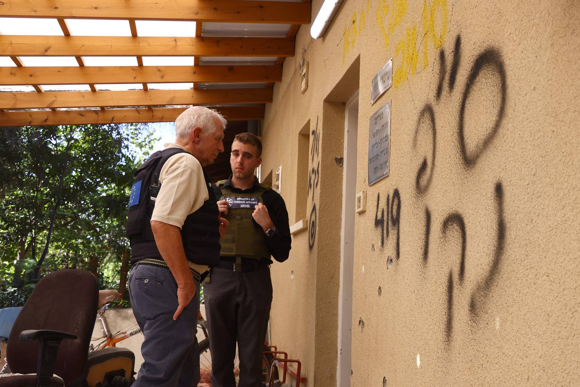 منسق السياسة الخارجية بالاتحاد الأوروبي جوزيب بوريل يدخل أحد المباني خلال زيارته كيبوتس بئيري بالقرب من الحدود مع قطاع غزة (أ.ف.ب)