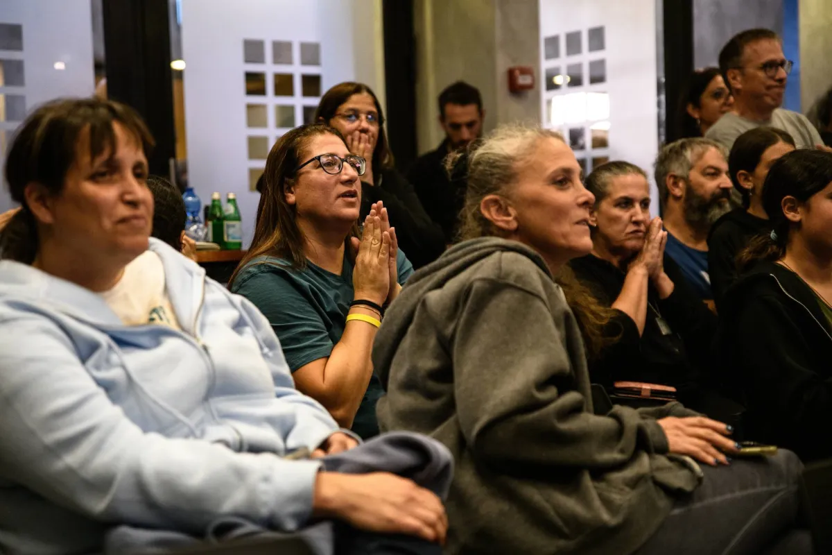 أعضاء من كيبوتس كفر عزة يتجمعون للقاء نساء وأطفال الكيبوتس الذين أُطلق سراحهم من أَسر «حماس» (د.ب.أ)