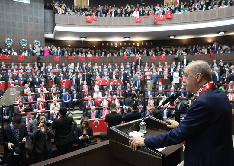 إردوغان متحدثاً خلال اجتماع المجموعة البرلمانية لحزب «العدالة والتنمية» الحاكم في تركيا الأربعاء (الرئاسة التركية)