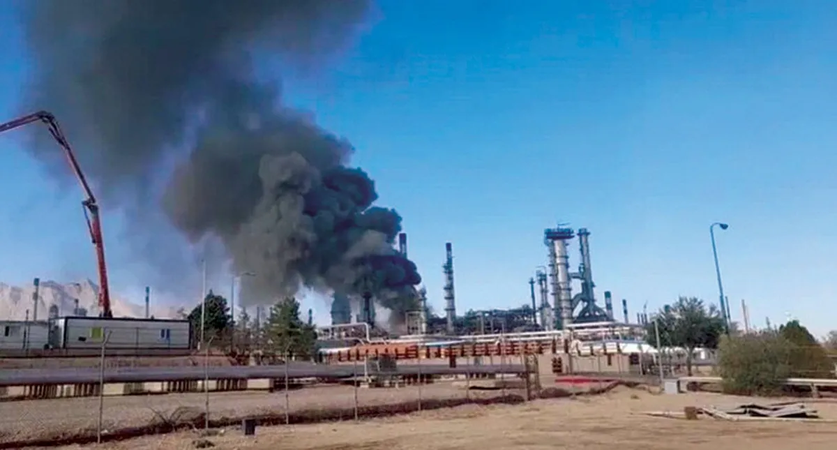 الدخان يتصاعد من أجزاء في مصفاة أصفهان وسط إيران صباح أمس (فارس)
