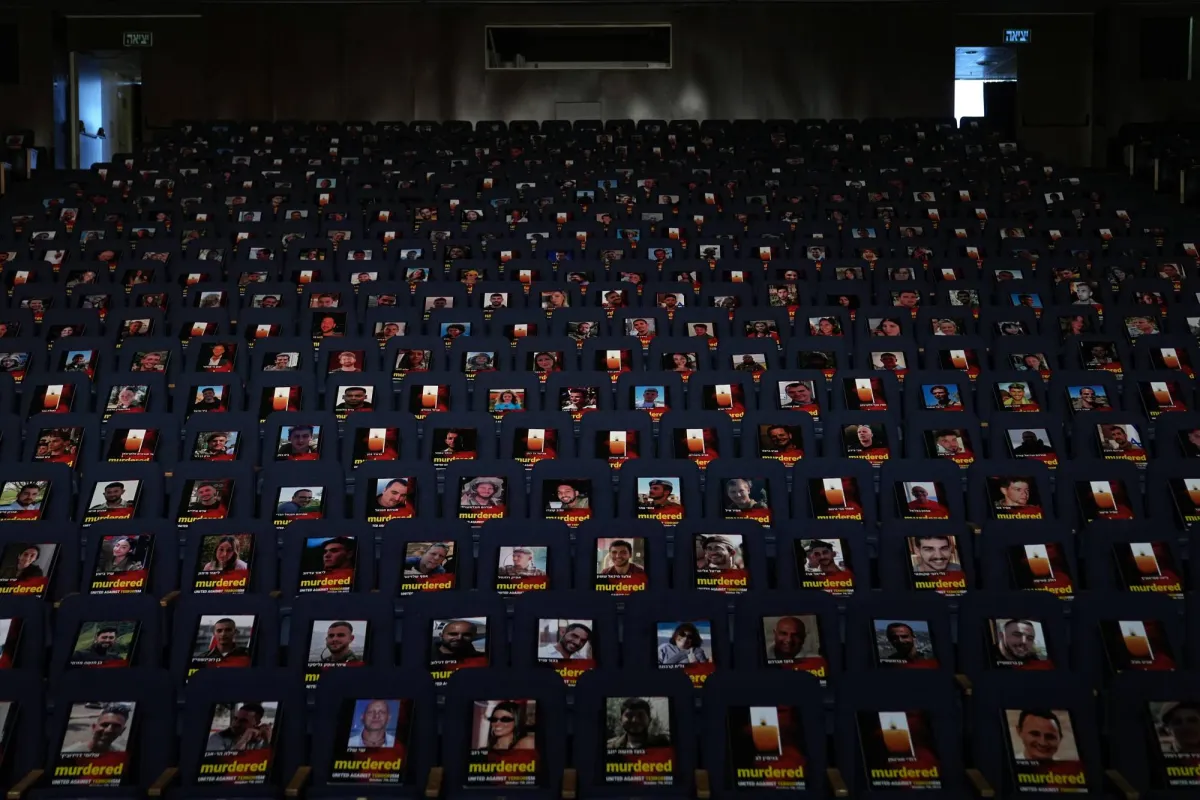 صور أكثر من ألف شخص قُتلوا أو فُقدوا أو اختُطفوا في هجوم «حماس» على إسرائيل يوم 7 أكتوبر على مقاعد فارغة بمعرض في قاعة سمولارز بجامعة تل أبيب، إسرائيل، في 22 أكتوبر 2023 (أ.ب)