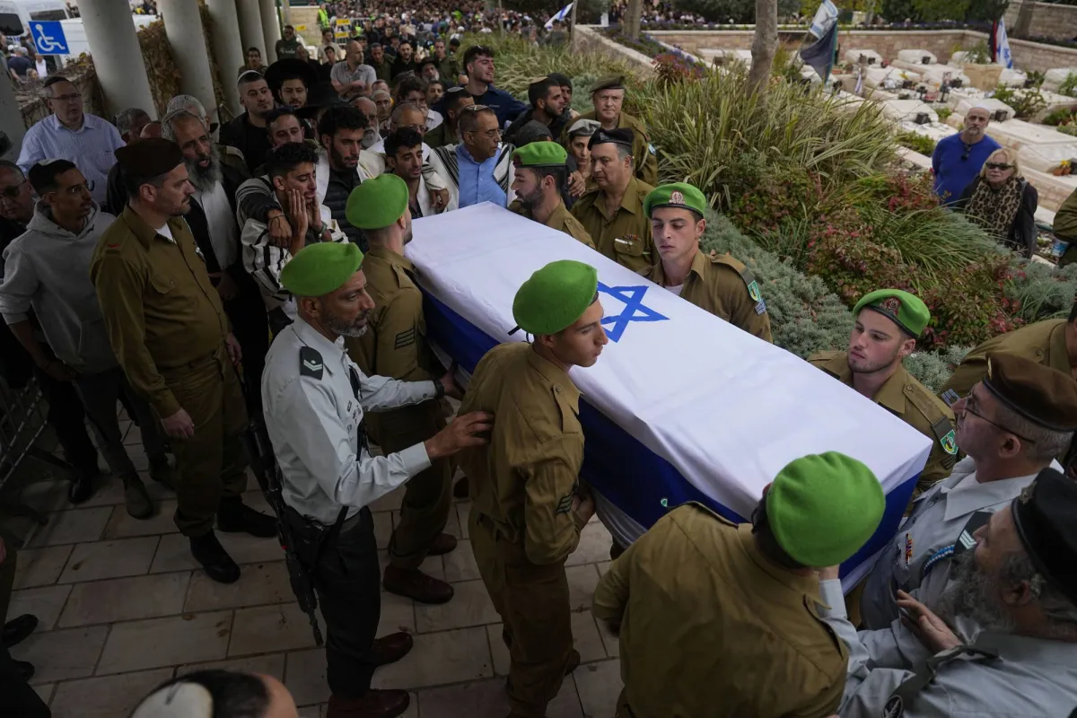 جنود إسرائيليون يحملون النعش المغطى بالعلم الإسرائيلي للرقيب لافي غازي بينما يرافقه أفراد العائلة والأصدقاء خلال جنازته في موديعين بإسرائيل يوم الخميس 21 ديسمبر 2023... قُتل غازي (19 عاماً) خلال العملية البرية للجيش الإسرائيلي في قطاع غزة (أ.ب)