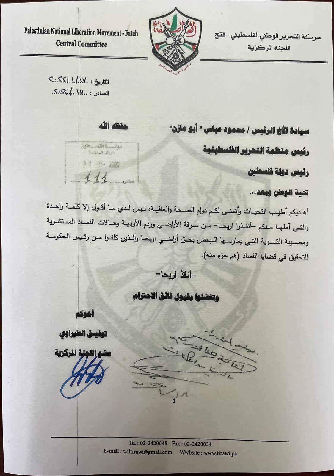 ودعا توفيق الطيرواي الذي كان يقود «جهاز المخابرات العامة» خلال قيادة ياسر عرفات للسلطة الفلسطينية (1996-2004)، الرئيس محمود عباس، إلى اتخاذ إجراءات لوقف الفساد. وقال في رسالة غير مسبوقة وجهها لعباس عبر مواقع التواصل الاجتماعي، إنه اضطر لمخاطبته علناً بعد عديد الرسائل التي أرسلها له، ولم تنته إلى شيء.
