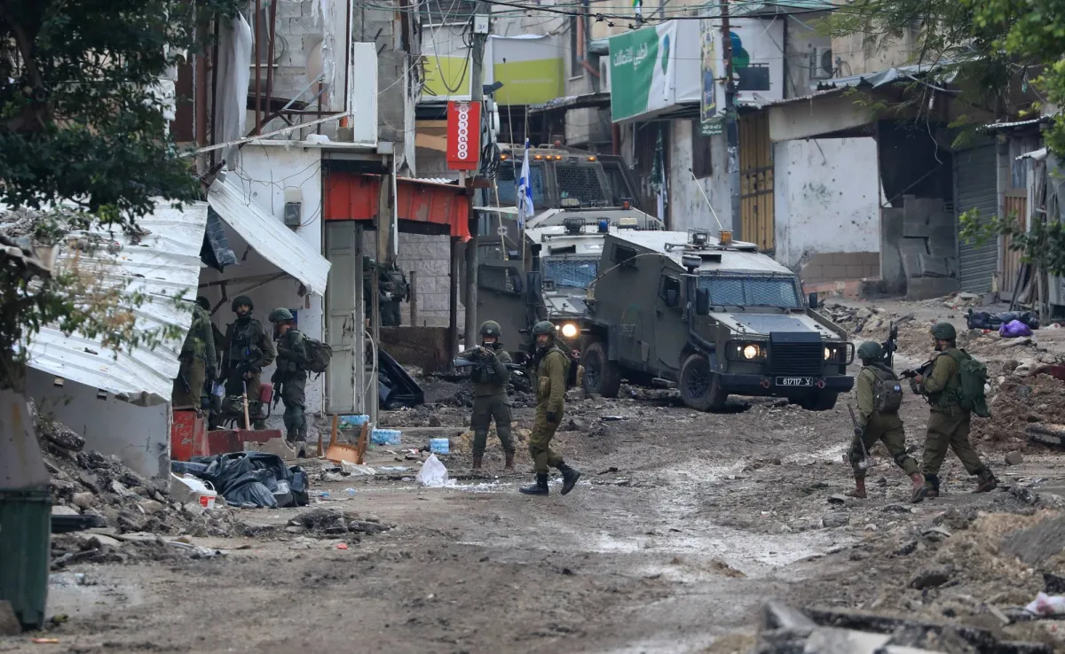جنود إسرائيليون يقومون بمداهمة في مدينة طولكرم بالضفة الغربية أمس (إ.ب.أ)