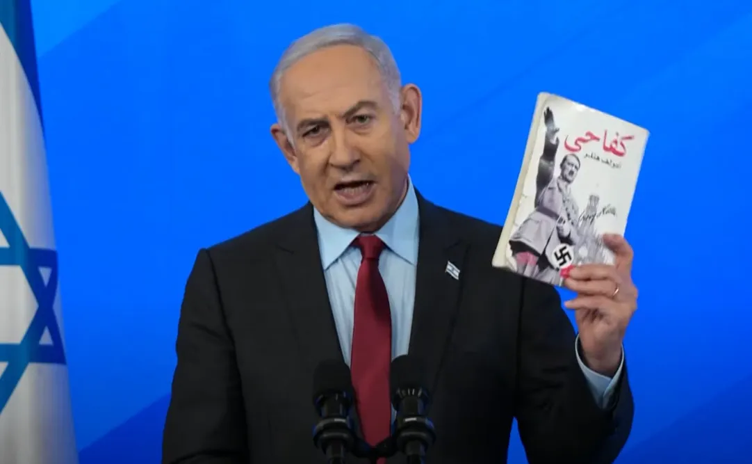 لقطة من خطاب تلفزيوني لرئيس الوزراء الإسرائيلي بنيامين نتنياهو يحمل كتاب «كفاحي» لهتلر 27 يناير (كانون الثاني) 2024