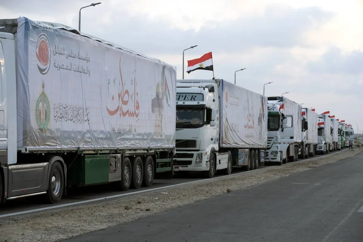 أرشيفية لشاحنات تحمل مساعدات متجهة إلى غزة تنتظر المرور عبر معبر رفح بمصر (إ.ب.أ)
