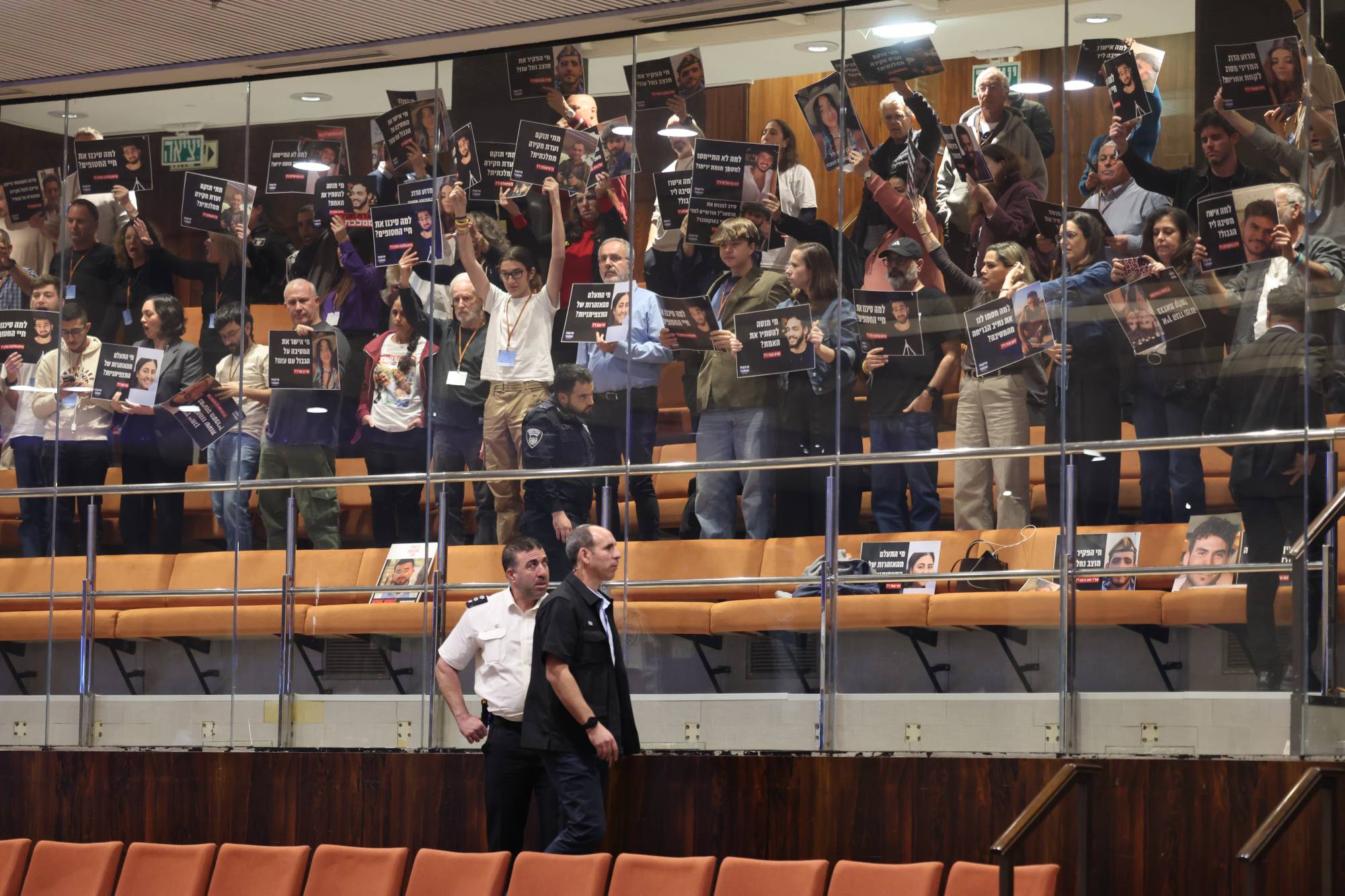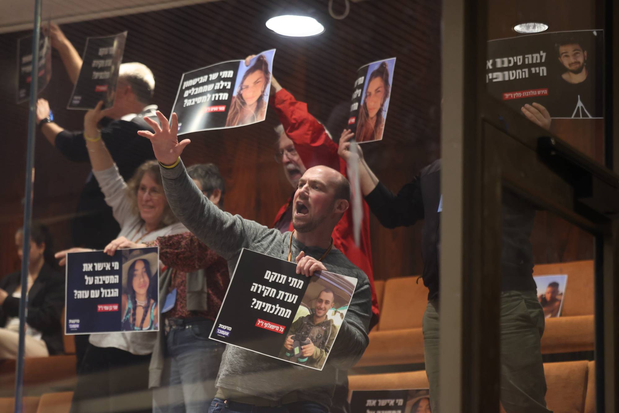 عائلات ضحايا هجوم 7 أكتوبر يرفعون شعارات وصوراً ضد طريقة تشكيل لجنة التحقيق في الهجوم داخل الكنيست (إ.ب.أ)