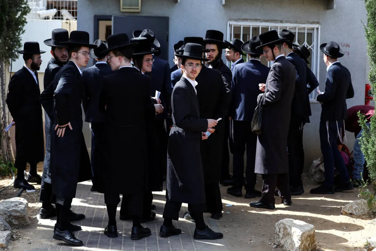 يهود متدينون يصطفون في مكتب تجنيد إسرائيلي لمعالجة إعفاءاتهم من الخدمة العسكرية الإلزامية في قاعدة تجنيد في كريات أونو بإسرائيل في 28 مارس 2024 (رويترز)