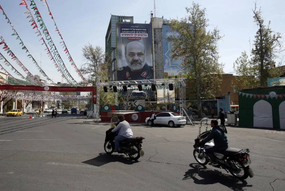 لوحة دعائية تعرض صورة العميد الإيراني محمد رضا زاهدي وتحمل شعارات بالعبرية تتوعد إسرائيل (إ.ب.أ)