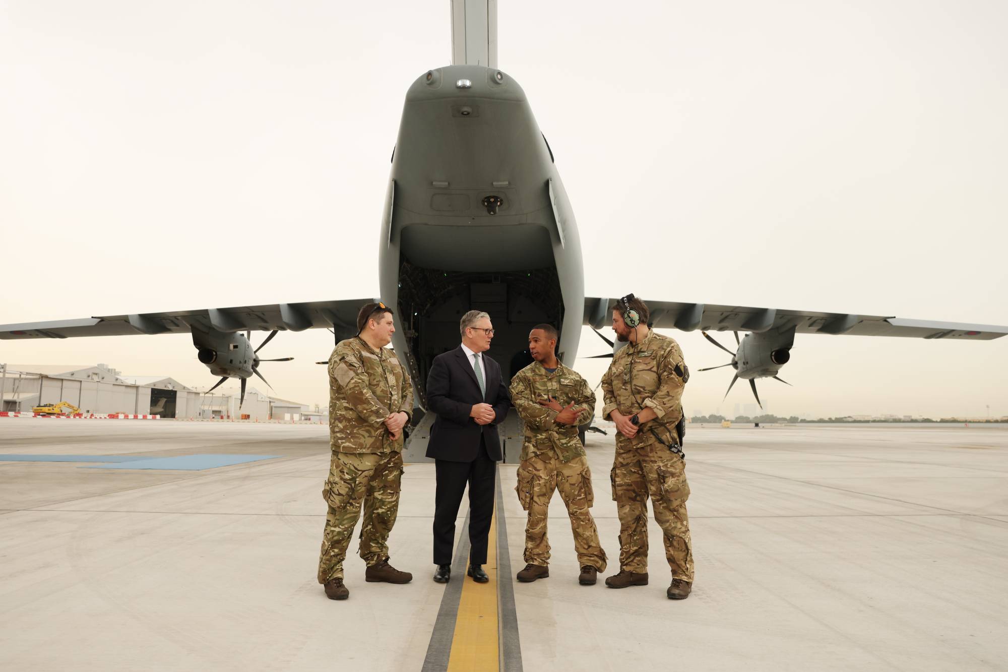 رئيس الوزراء البريطاني خلال لقائه فريق طائرة «إيه 400» التابعة للقوات المسلحة البريطانية في أبوظبي يوم 9 أبريل 2026 بمناسبة جولته الخليجية (إ.ب.أ)