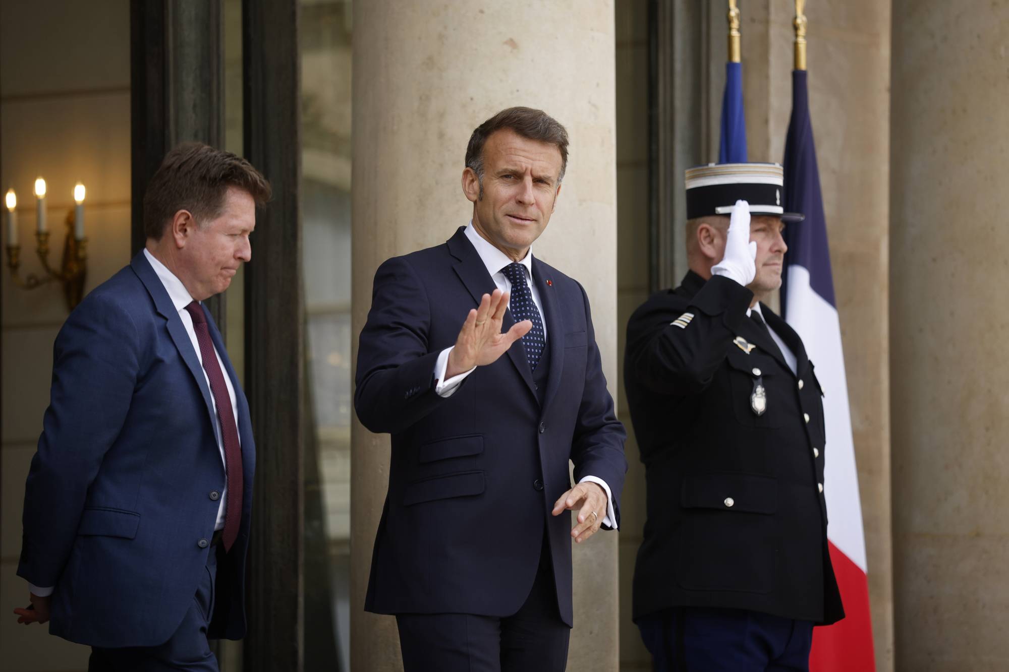 الرئيس الفرنسي إيمانويل ماكرون ينتظر عند مدخل «الإليزيه» وصول رئيس «الاتحاد الأفريقي» محمود علي يوسف الاثنين (إ.ب.أ)