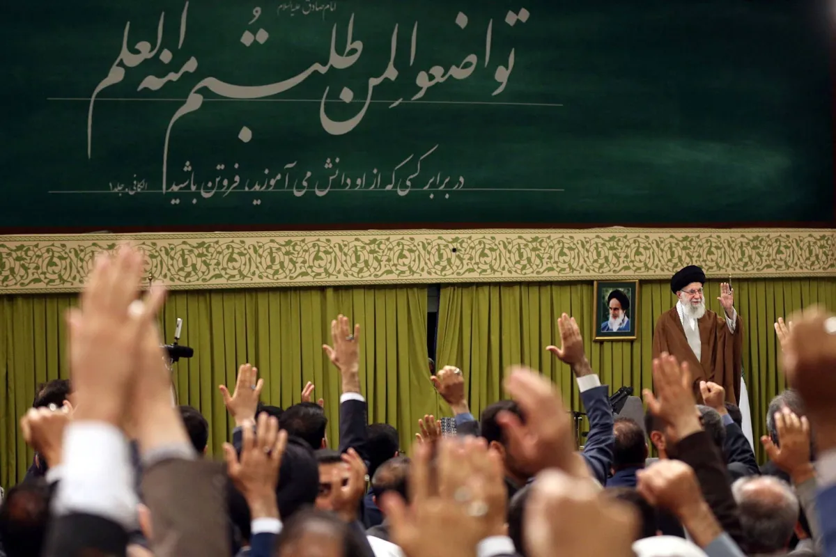 خامنئي يلوح لحشد من المعلمين في طهران في 1 مايو 2024 (رويترز)