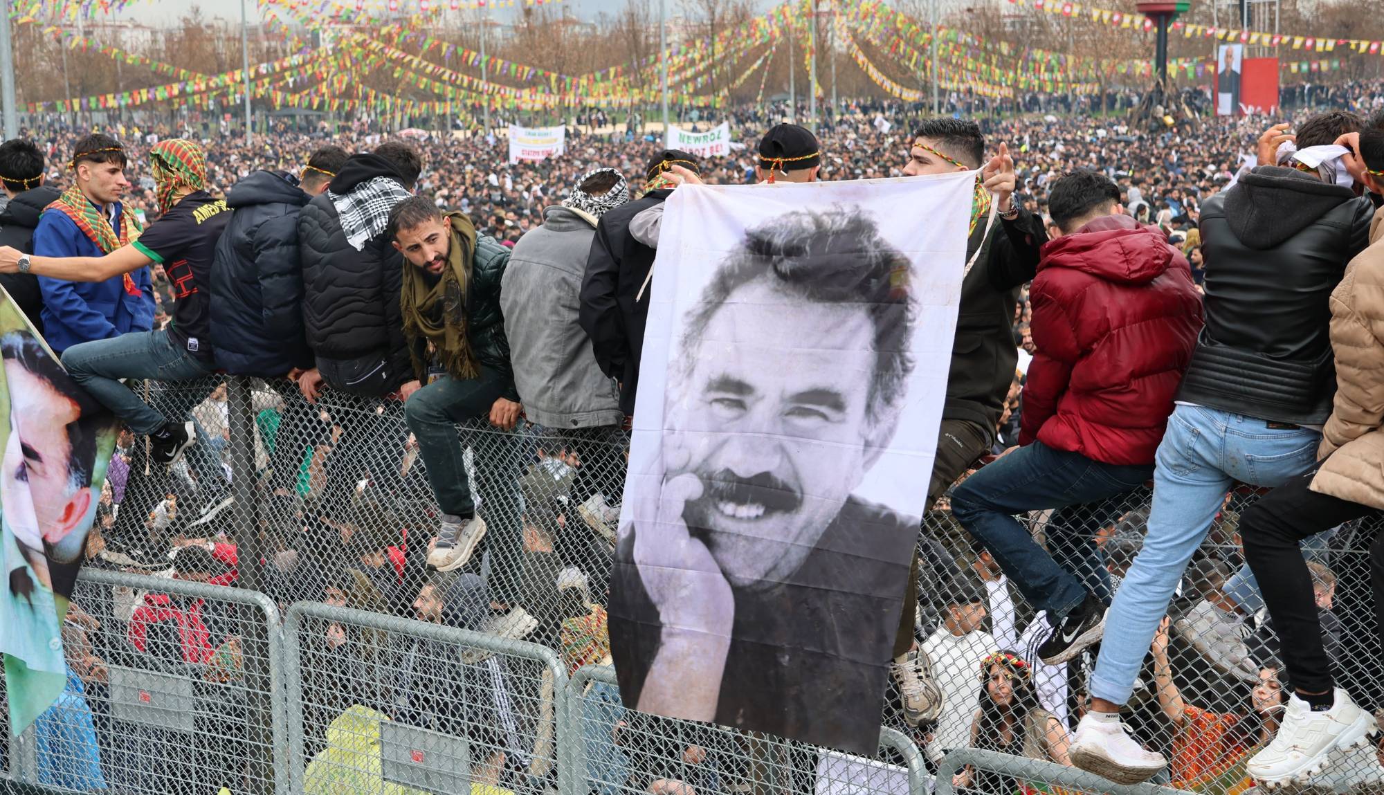 أكراد يرفعون صورة لأوجلان خلال احتفالات عيد النوروز في ديار بكر جنوب شرقي تركيا في 21 مارس الحالي مطالبين بإطلاق سراحه (حساب حزب الديمقراطية والمساواة للشعوب في إكس)