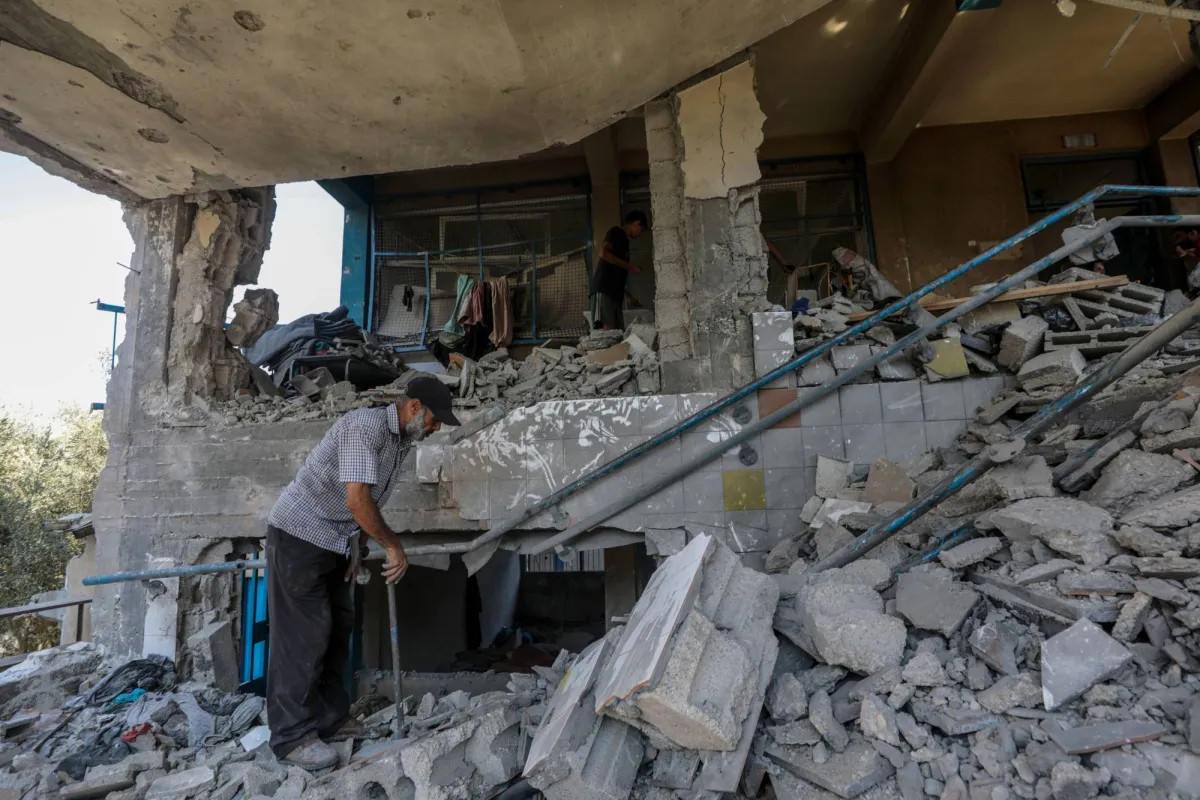 فلسطيني وسط حطام مدرسة «أبو عريبان» بعد الهجوم الإسرائيلي عليها (إ.ب.أ)