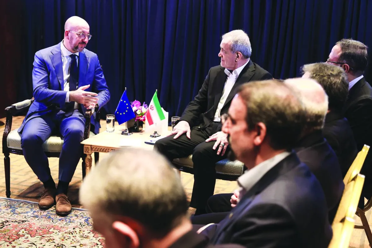 بزشكيان يلتقي رئيس المجلس الأوروبي شارل ميشال في نيويورك أمس (الرئاسة الإيرانية)