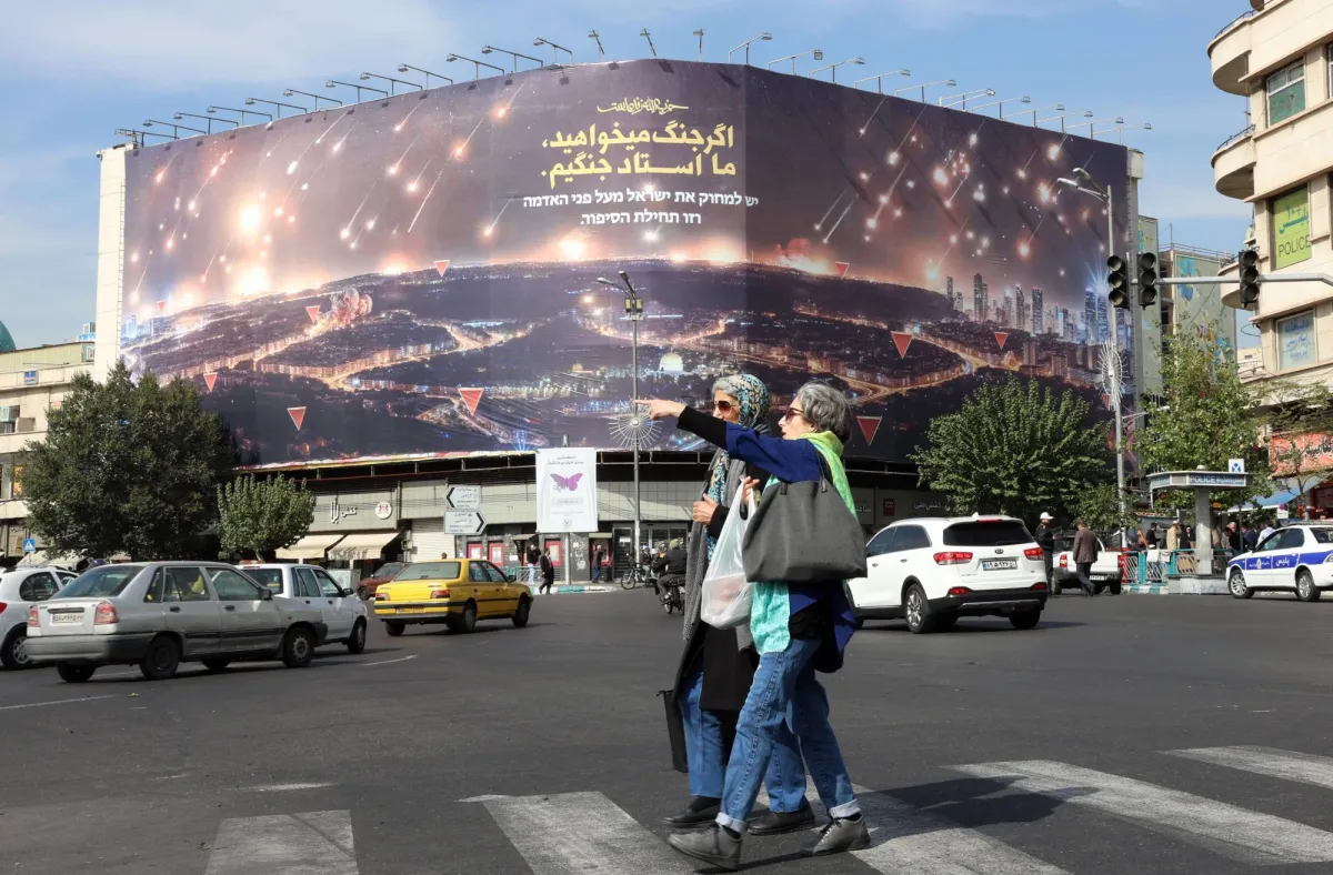 إيرانيات يمشين بالقرب من لافتة معادية لإسرائيل مع عبارة باللغة الفارسية تقول: «إذا كنتم تريدون الحرب فنحن أسياد الحرب» في ساحة انقلاب (الثورة) في طهران (إ.ب.أ)