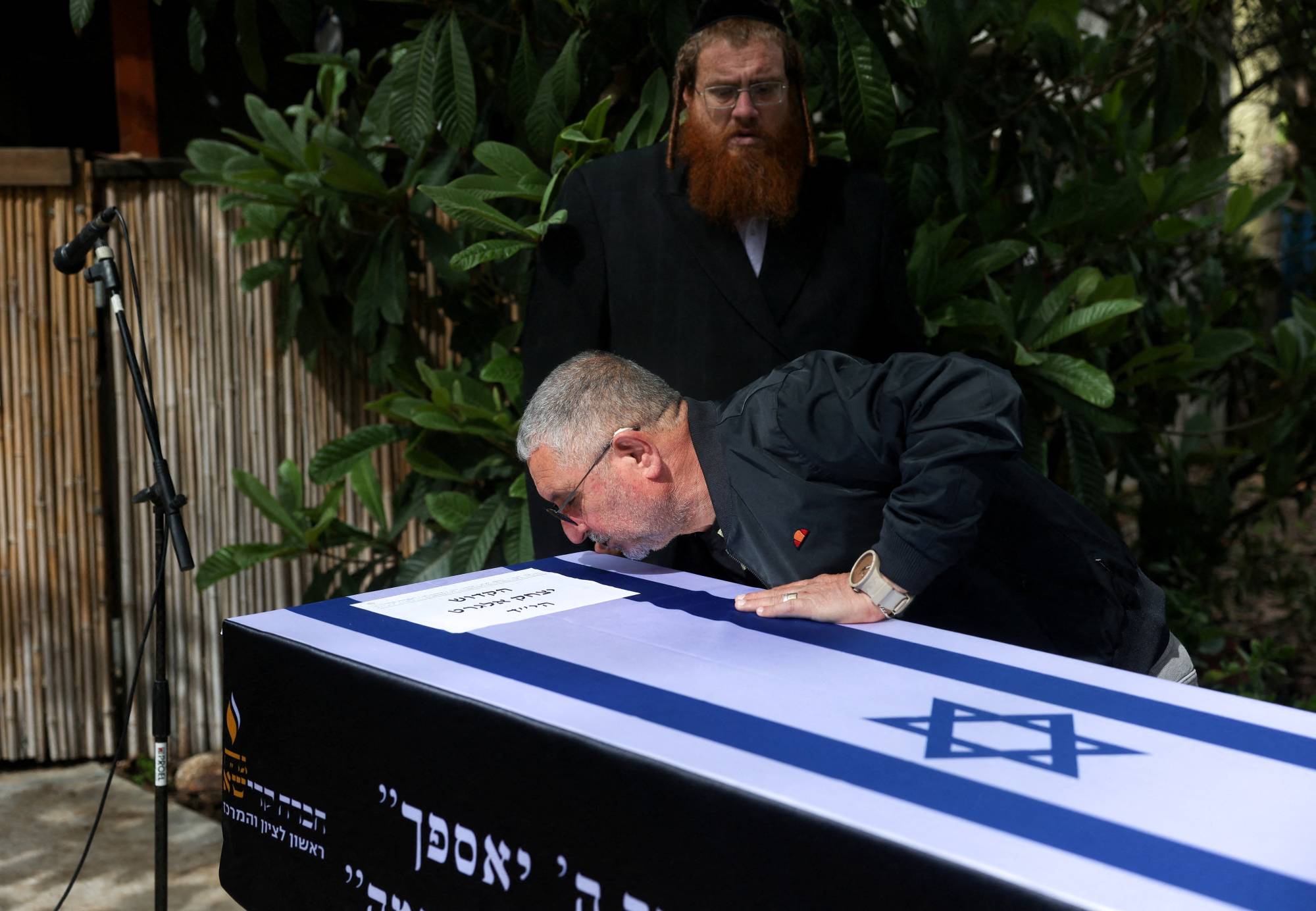داني إلغارات، شقيق إيتزيك إلغارات، الذي اختطف من منزله في كيبوتس نير عوز خلال هجوم «حماس» في 7 أكتوبر 2023 وقتل في غزة، يقبّل نعش شقيقه أثناء جنازته في كيبوتس نير عوز، إسرائيل، 3 مارس 2025 (رويترز)