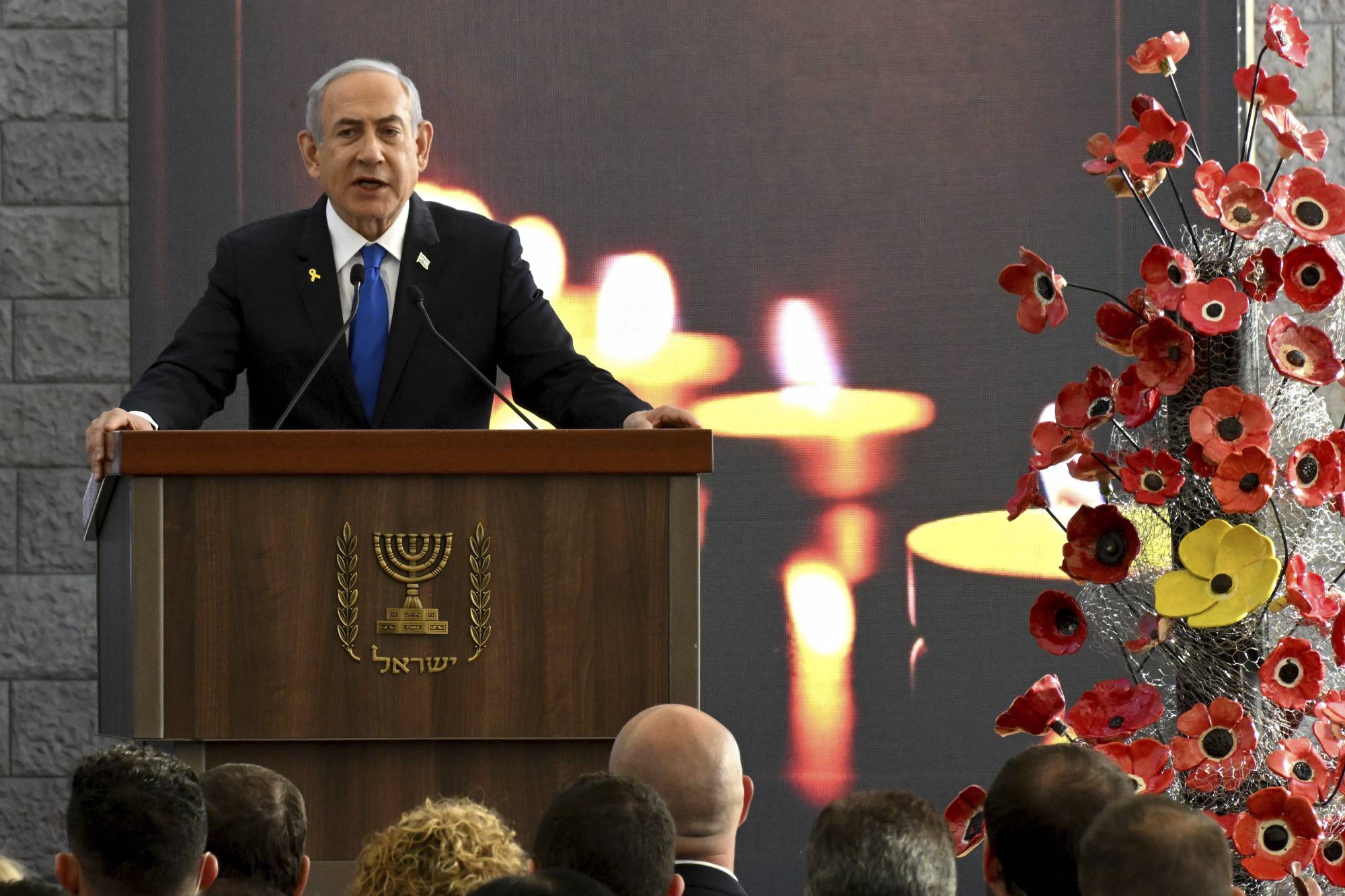 رئيس الوزراء الإسرائيلي بنيامين نتنياهو يتحدث في حفل تذكاري لأولئك الذين سقطوا في هجوم 7 أكتوبر 2023، في القدس 28 أكتوبر 2024 (أ.ب)