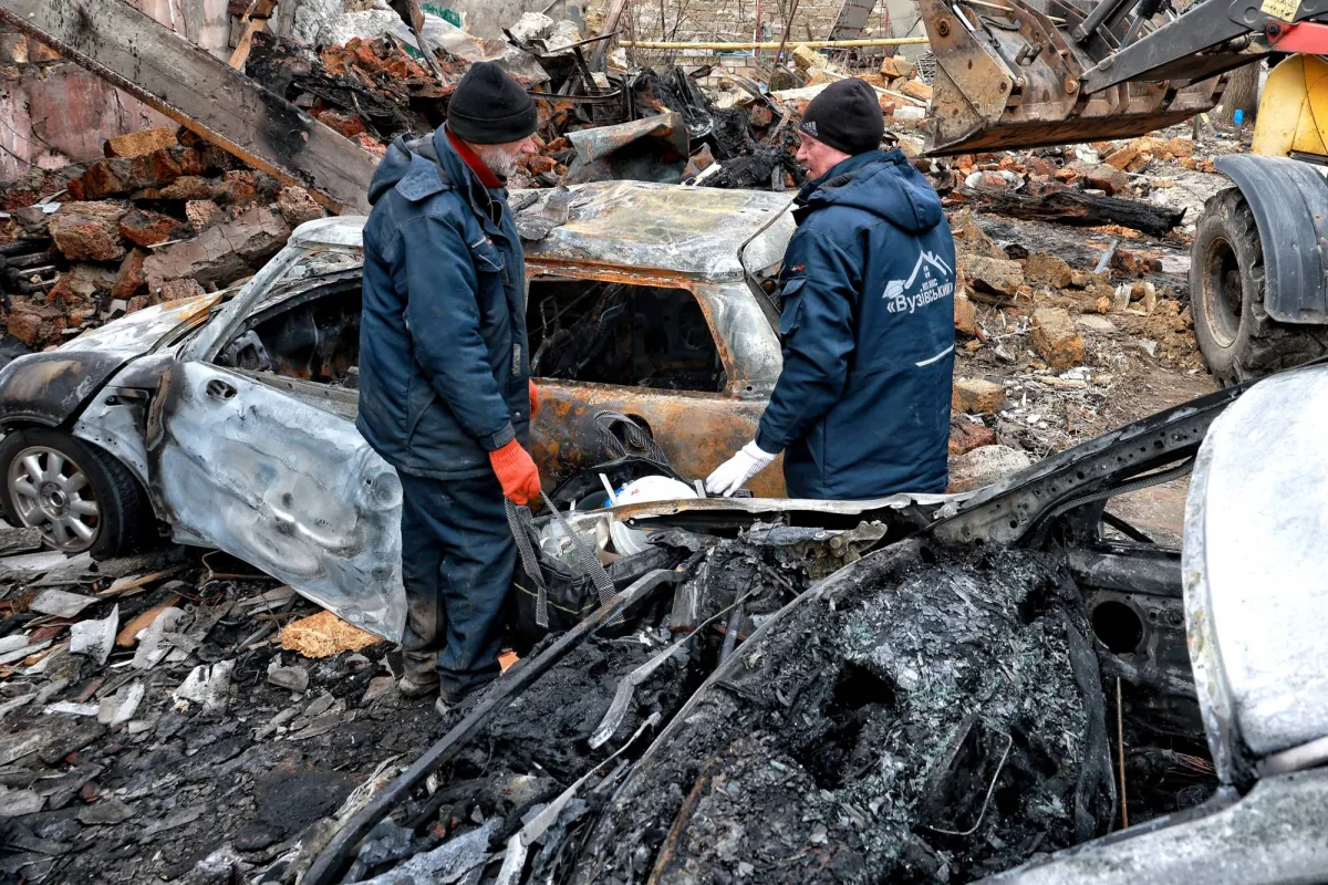 يقف عمال المرافق العامة بجوار السيارات المحترقة نتيجة هجوم بطائرة دون طيار روسية على أوديسا (د.ب.أ)