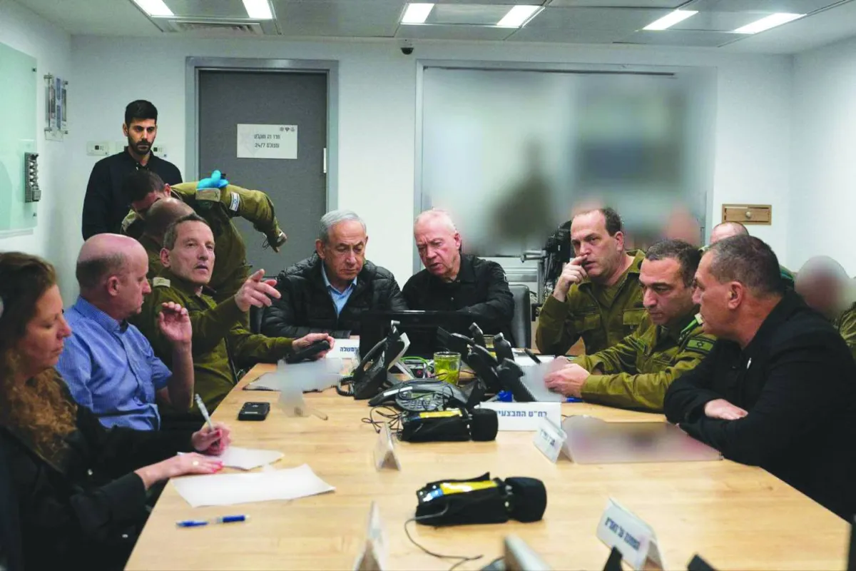 من اليسار إلى اليمين: وزير الدفاع يسرائيل كاتس والسكرتير العسكري لرئيس الوزراء اللواء رومان غوفمان وبنيامين نتنياهو ورئيس ديوان مكتبه تساحي برافرمان والقائم بأعمال رئيس جهاز الأمن العام (الشاباك) يظهرون بمركز قيادة خلال الغارات في قطر (الشاباك)