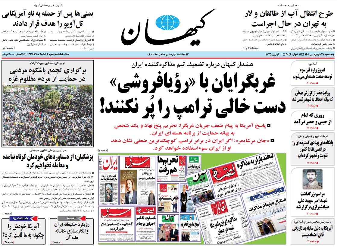 وخاطبت صحيفة «كيهان» الرسمية، المؤيدين للتفاوض مع الولايات المتحدة. وكتبت في عنوانها الرئيسي: «على أصحاب التوجه الغربي ألا يملأوا جعبة ترمب بالوعود الفارغة».