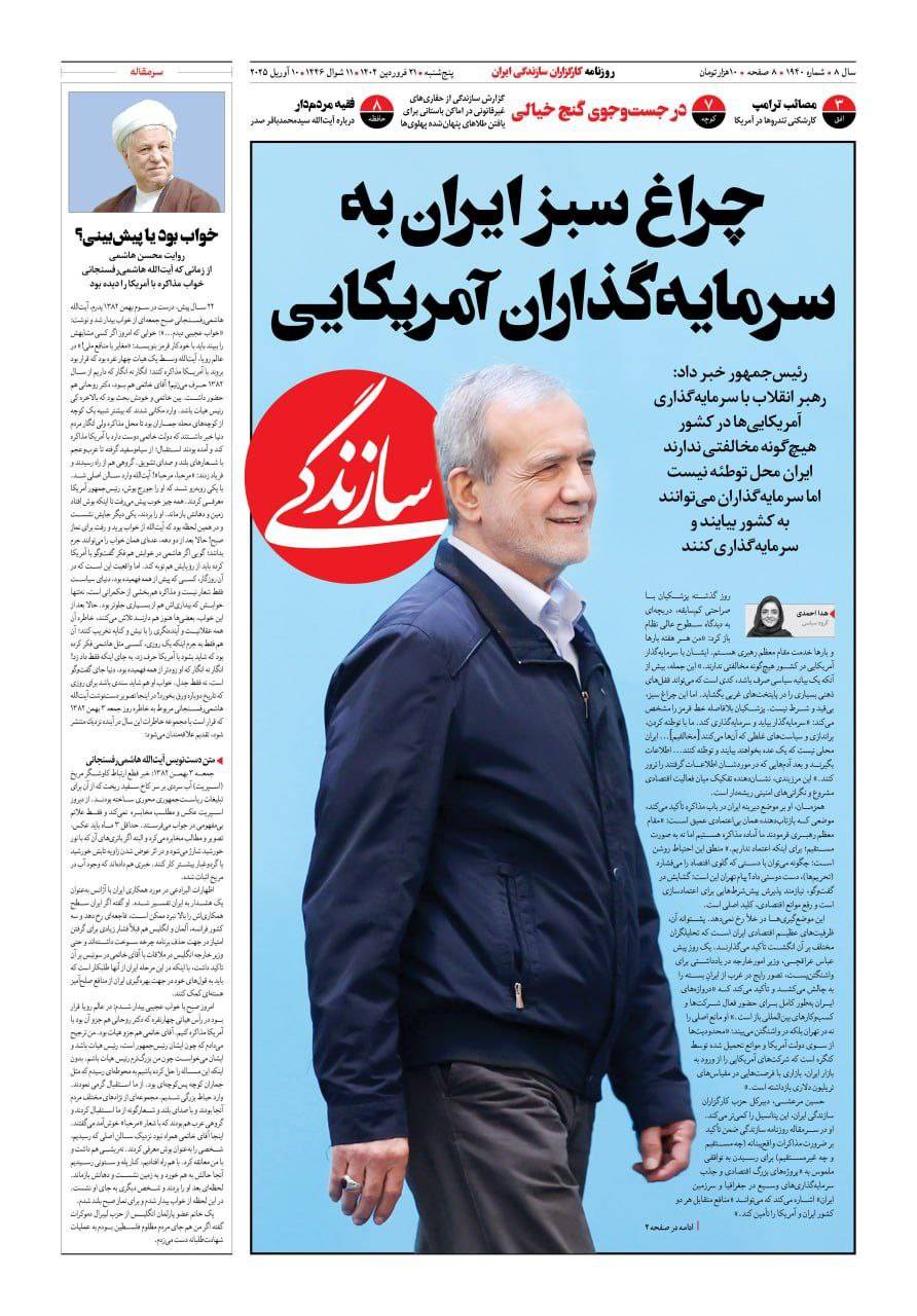 وقالت صحيفة «سازندكي»، الناطقة باسم فصيل الرئيس الأسبق، علي أكبر هاشمي رفسنجاني، إن «إيران منحت الضوء الأخضر للمستثمرين الأميركيين»، وأضافت: «بصراحة غير مسبوق فتح نافذة على وجهة نظر أعلى مستويات النظام». وأشارت إلى الخط الأحمر الذي حدده بزشكيان بشأن «مؤامرات الإطاحة بالنظام». وقالت إن هذا الأمر «يظهر أن الفكاك بين الأنشطة الاقتصادية والمخاوف الأمنية متجذر».