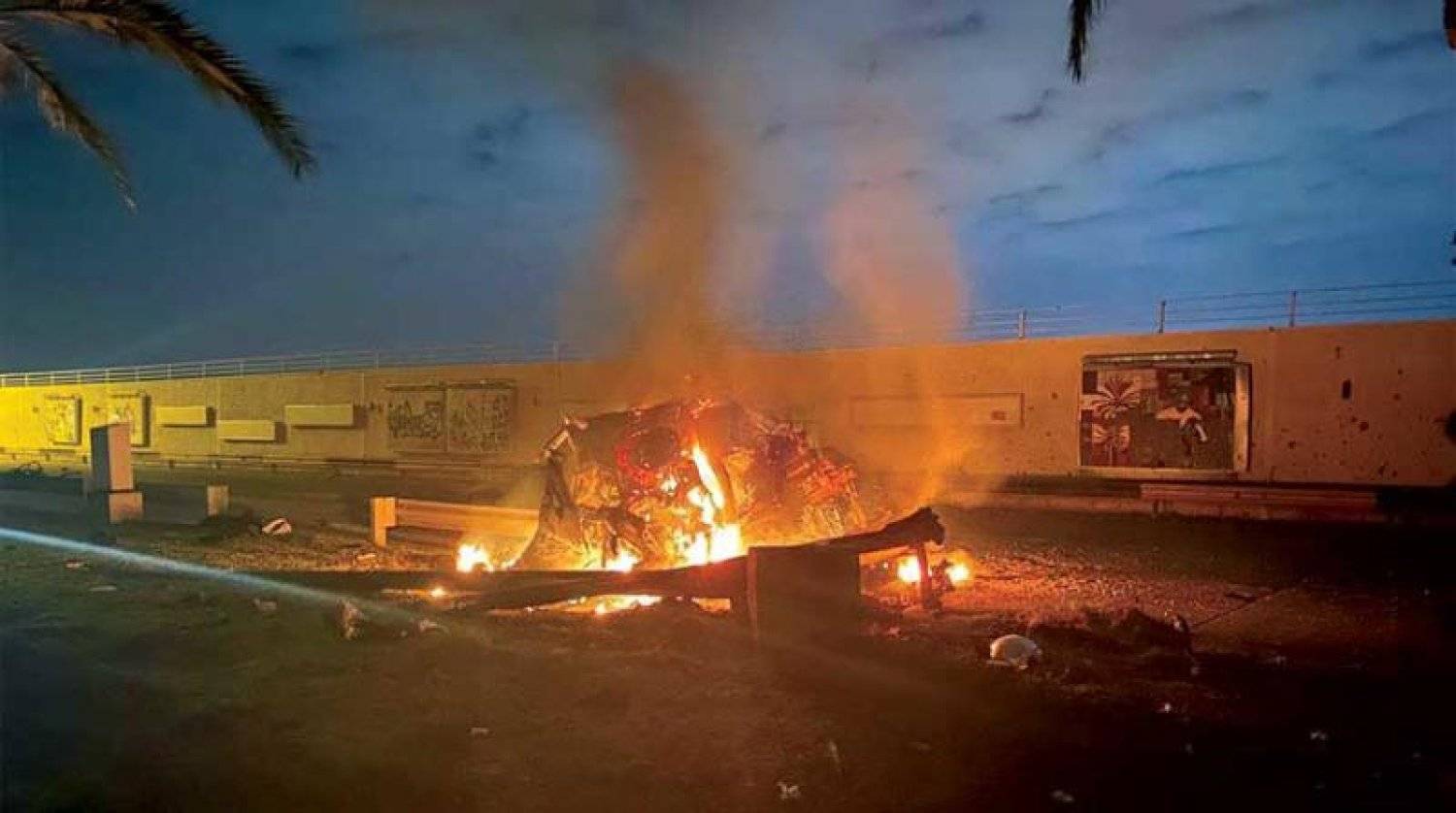 السيارة التي كان يستقلها سليماني مشتعلة بعد استهدافها بصواريخ أميركية في 3 يناير 2020 (أ.ف.ب)