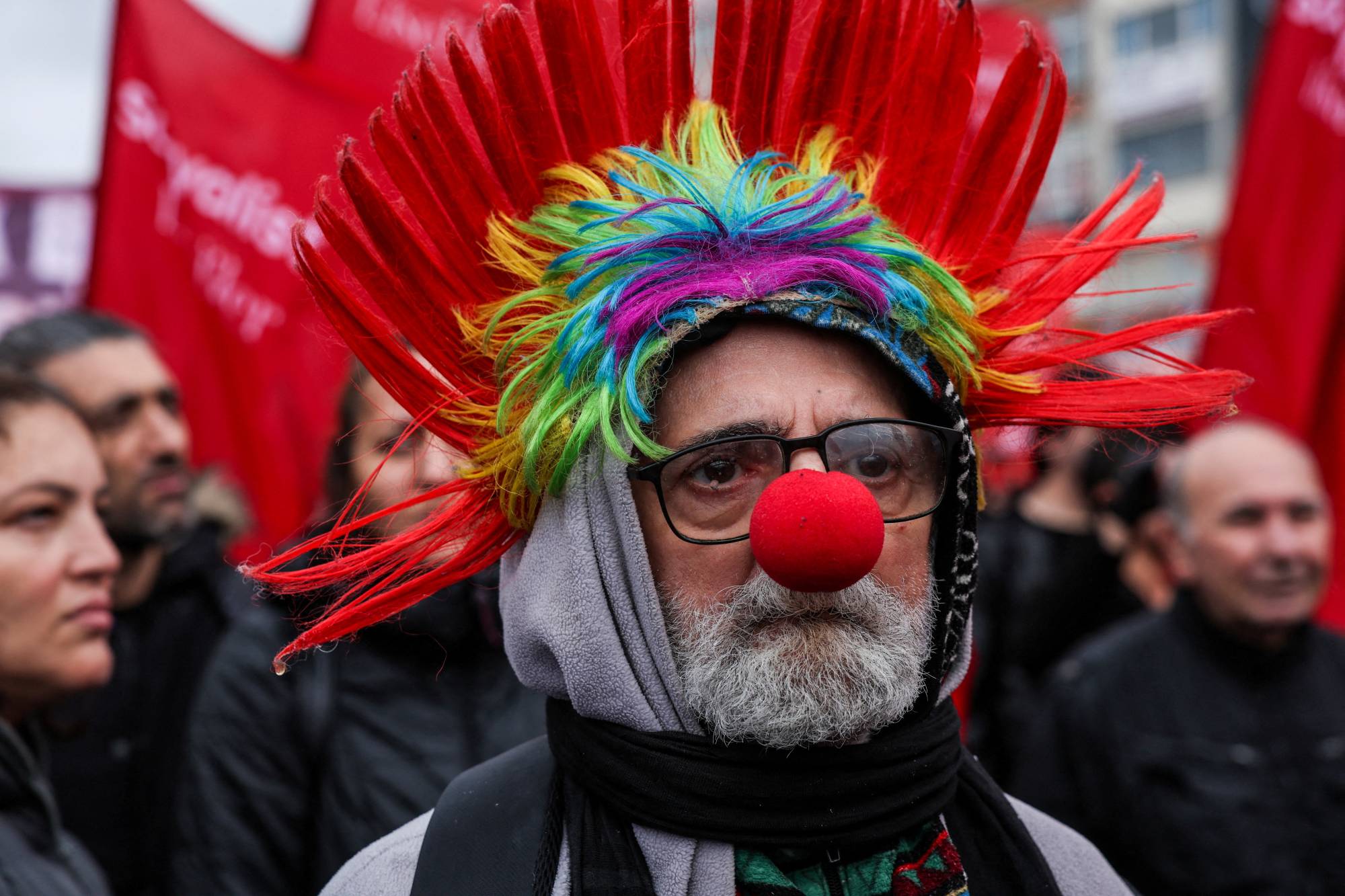 متظاهر تركي يرتدي أنف مهرج أحمر خلال مظاهرات عيد العمال بإسطنبول (رويترز)