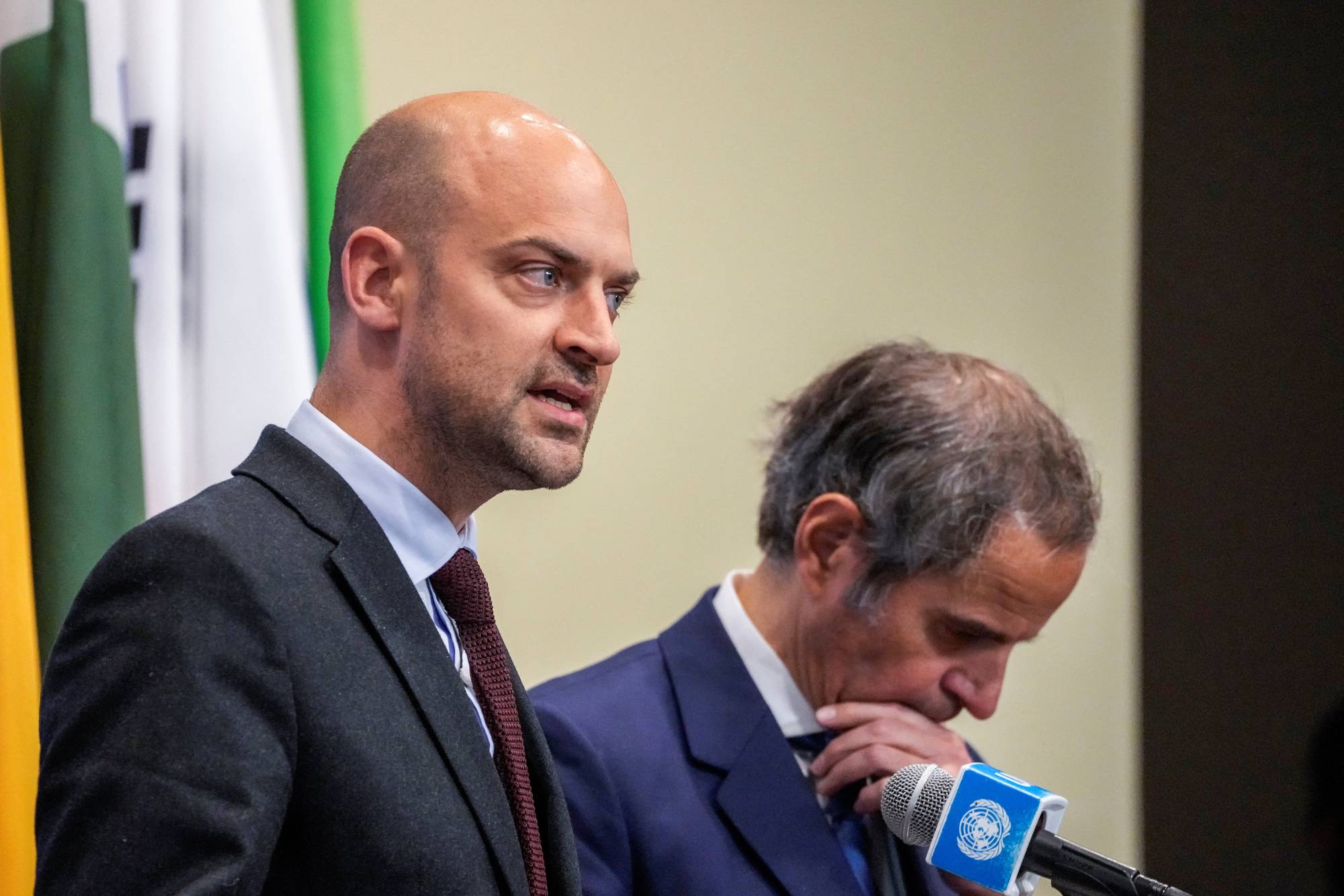 بارو ومدير الوكالة الدولية للطاقة الذرية رافائيل غروسي يتحدثان للصحافيين بشأن ملف إيران على هامش جلسة مجلس الأمن في نيويورك الاثنين الماضي (رويترز)
