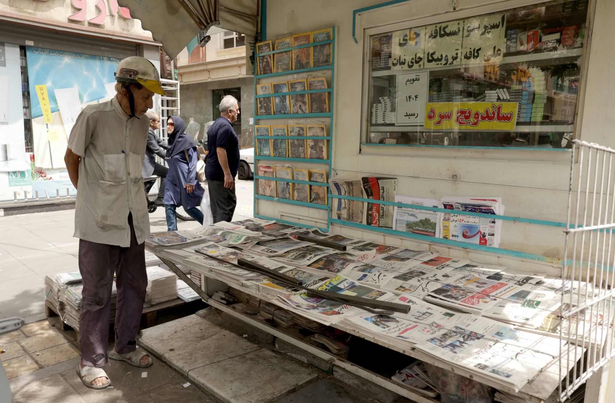 عامل إيراني يتفقد الصحف في كشك بطهران بعد الجولة الأخيرة من المحادثات في مسقط (إ.ب.أ)