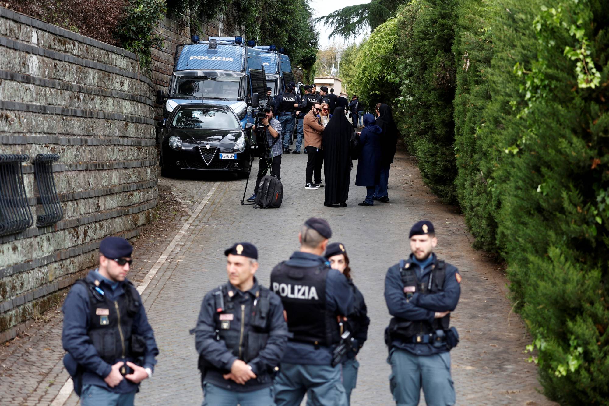 الشرطة الإيطالية تقف عند أحد مداخل السفارة العُمانية أثناء الجولة الثانية من المحادثات بين الولايات المتحدة وإيران في روما 19 أبريل 2025 (رويترز)