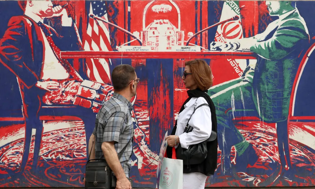 إيرانيان يمران أمام جدارية معادية للولايات المتحدة على حائط سفارتها السابقة في طهران (إ.ب.أ)