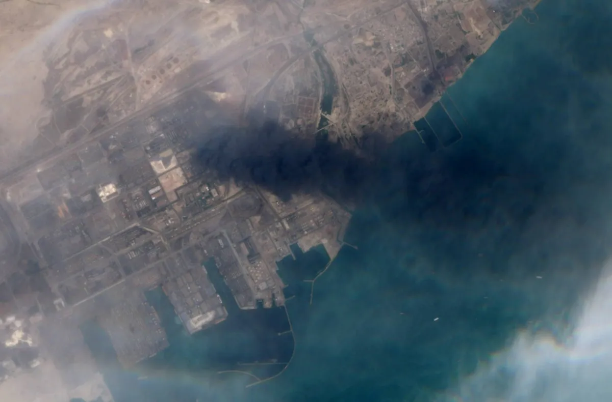 صورة فضائية من قمر «ماكسار» تُظهر تصاعد الدخان من الانفجار في رصيف «رجائي» بميناء «بندر عباس» جنوب إيران (رويترز)