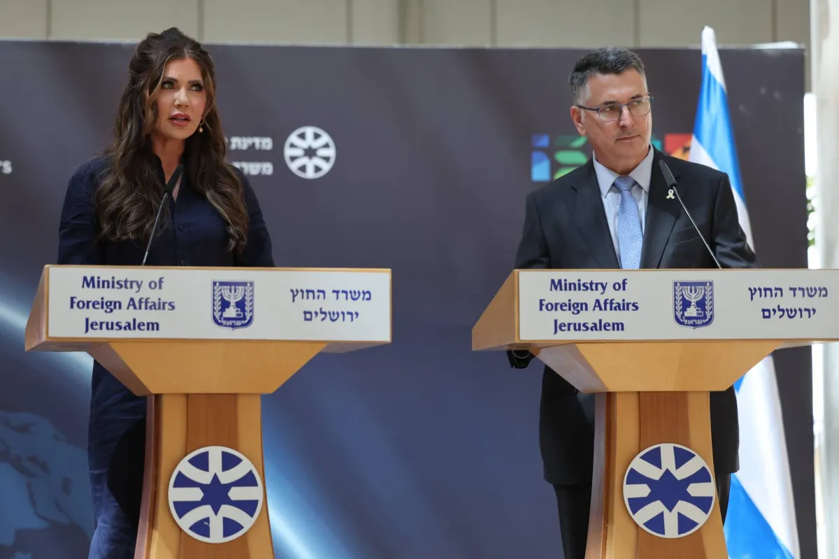 وزيرة الأمن الداخلي الأميركي كريستي نويم في مؤتمر صحافي مع وزير الخارجية الإسرائيلي جدعون ساعر في القدس (إ.ب.أ)