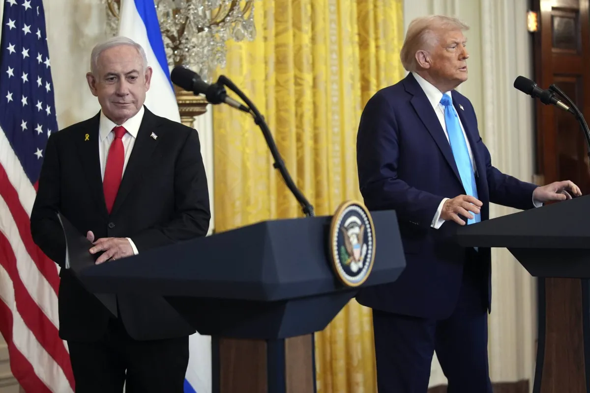ترمب ونتنياهو خلال مؤتمر صحافي في البيت الأبيض فبراير الماضي (أ.ب)