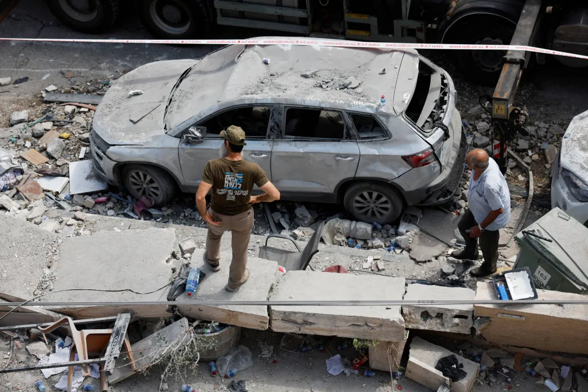 أشخاص يقفون بجوار مركبة متضررة بعد أن أصابت صواريخ أُطلقت من إيران مبنى سكنياً في طمرة شمال إسرائيل (رويترز)