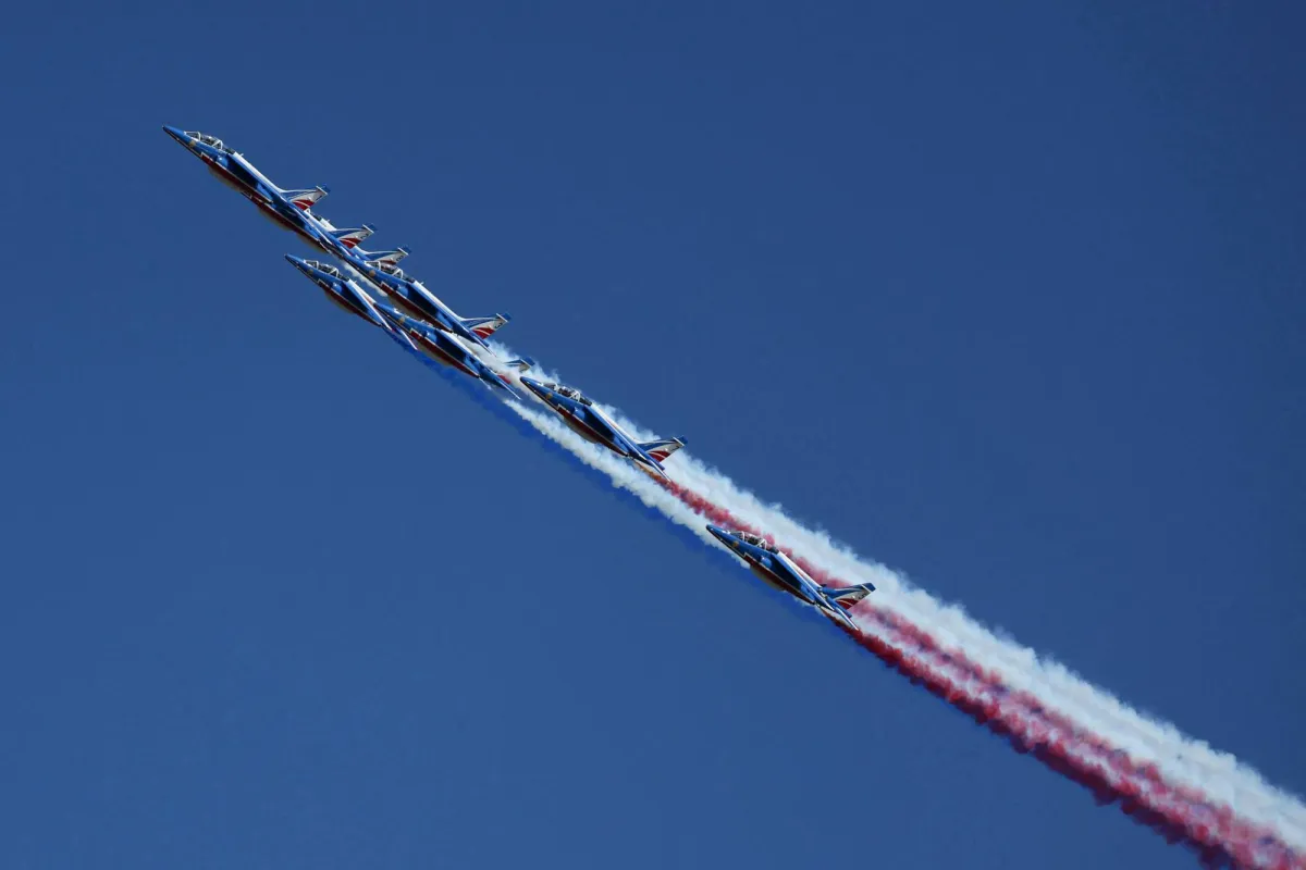 طائرات «ألفا» التابعة لفريق الاستعراض الجوي «باتروي دو فرنس» التابع لسلاح الجو الفرنسي وهي تؤدي عرضاً جوياً استعراضياً خلال النسخة الخامسة والخمسين من معرض باريس الجوي الدولي في مطار باريس (أ.ف.ب)