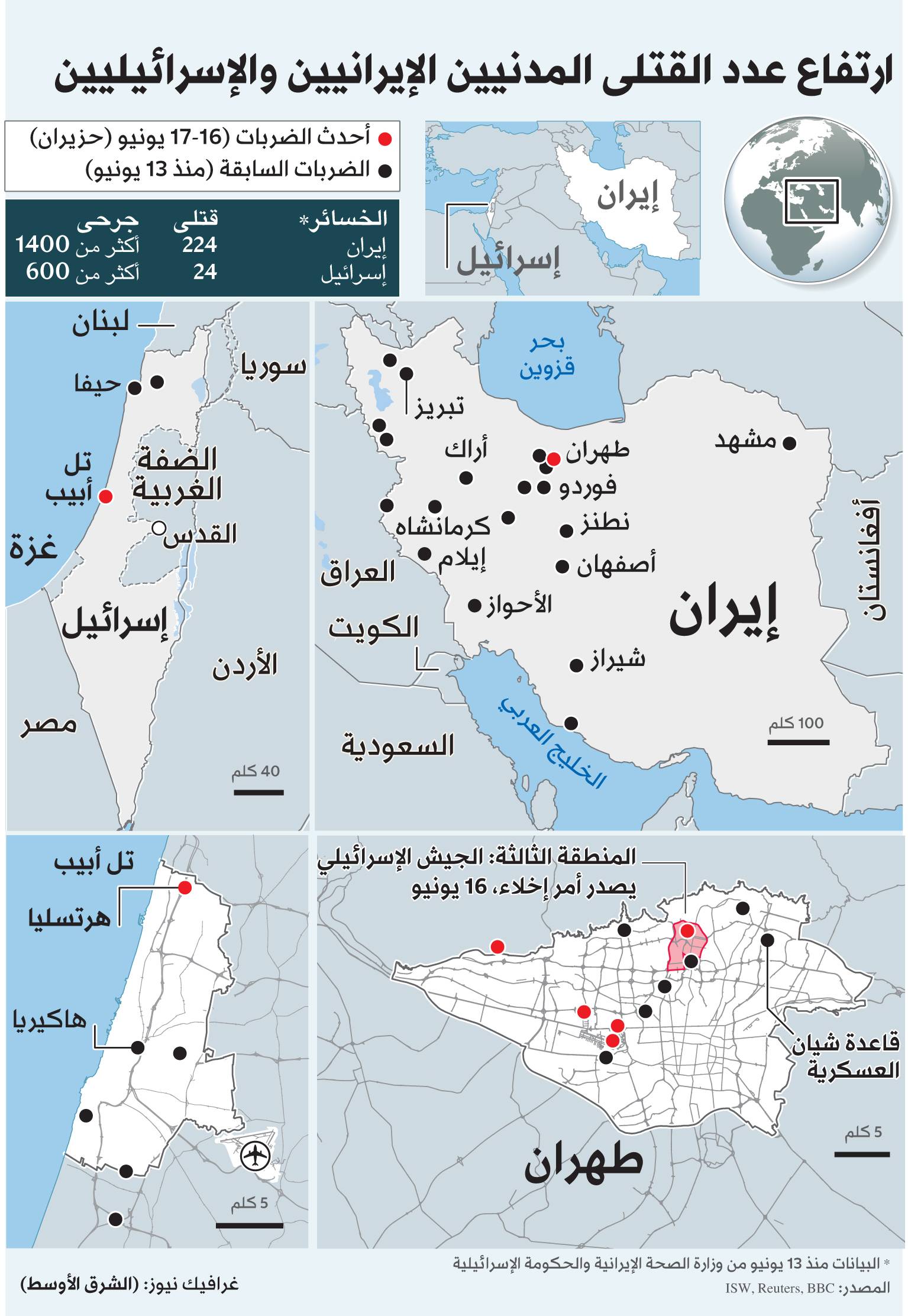 وكانت إسرائيل قد شنت، الجمعة، ضربات جوية واسعة النطاق على أراض إيرانية، استهدفت منشآت نووية ومواقع دفاعية وأهدافاً مدنية وبنية تحتية للنفط والغاز. ووصفت طهران هذه الهجمات بأنها إعلان حرب وردت عليها.