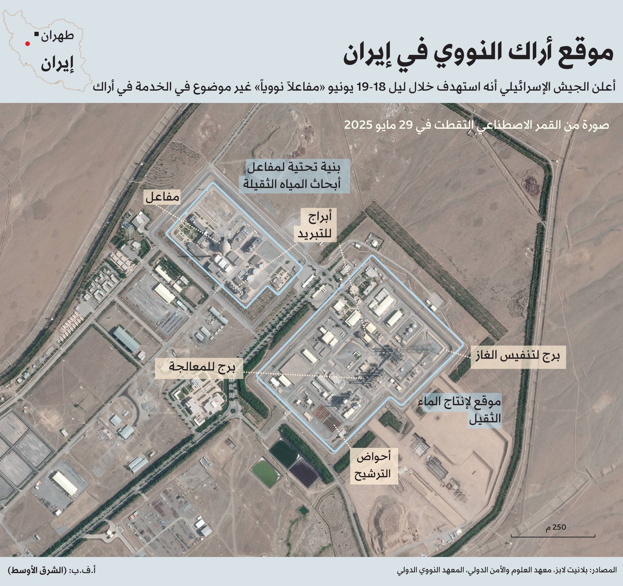 وفي وقت سابق، أعلنت إسرائيل أنها ضربت مفاعل أراك (خنداب) للمياه الثقيلة خلال الليل حيث كانت تبني إيران مفاعلاً يعمل بالماء الثقيل... وذكرت أن الهدف هو منع إعادة تأهيل المفاعل لاستخدامه لأغراض عسكرية. وتُنتج مفاعلات الماء الثقيل البلوتونيوم الذي يمكن استخدامه، مثل اليورانيوم المخصب، في صنع نواة قنبلة ذرية.