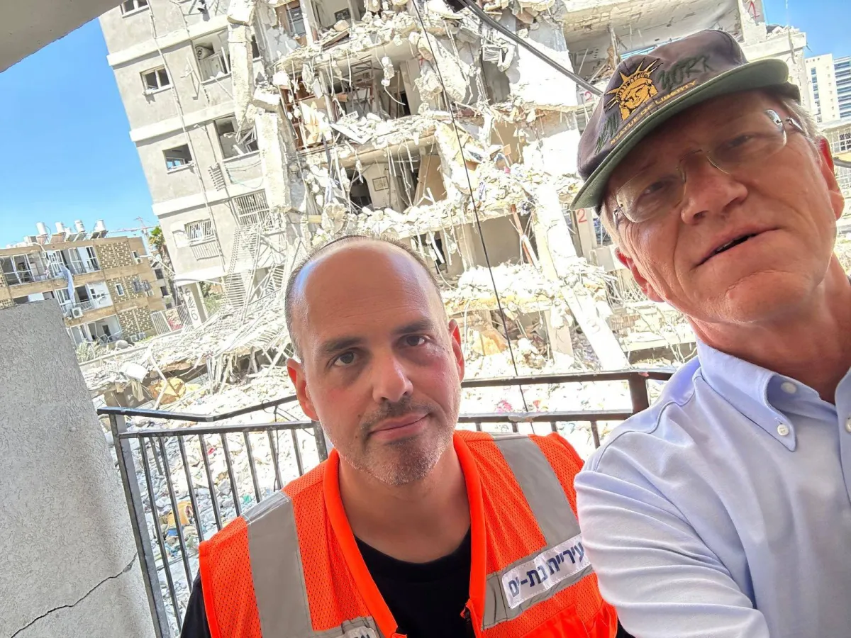 سفير النرويج لدى إسرائيل بير إيجل سيلفاج (يمين) خلال زيارته أحد المباني المتضررة من القصف الإيراني في بات يام (حساب السفارة عبر منصة إكس)