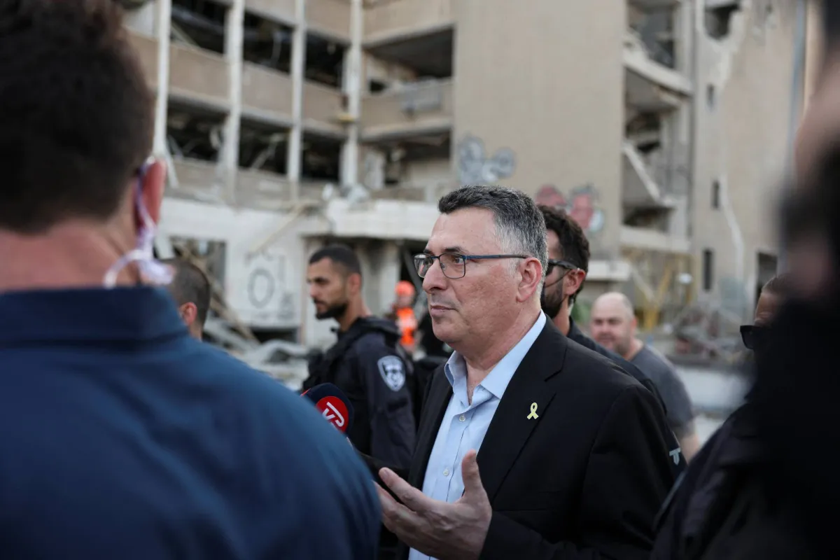 وزير الخارجية الإسرائيلي جدعون ساعر يتحدث للصحافيين عقب تفقده موقع سقوط صاروخ إيراني في حيفا (رويترز)