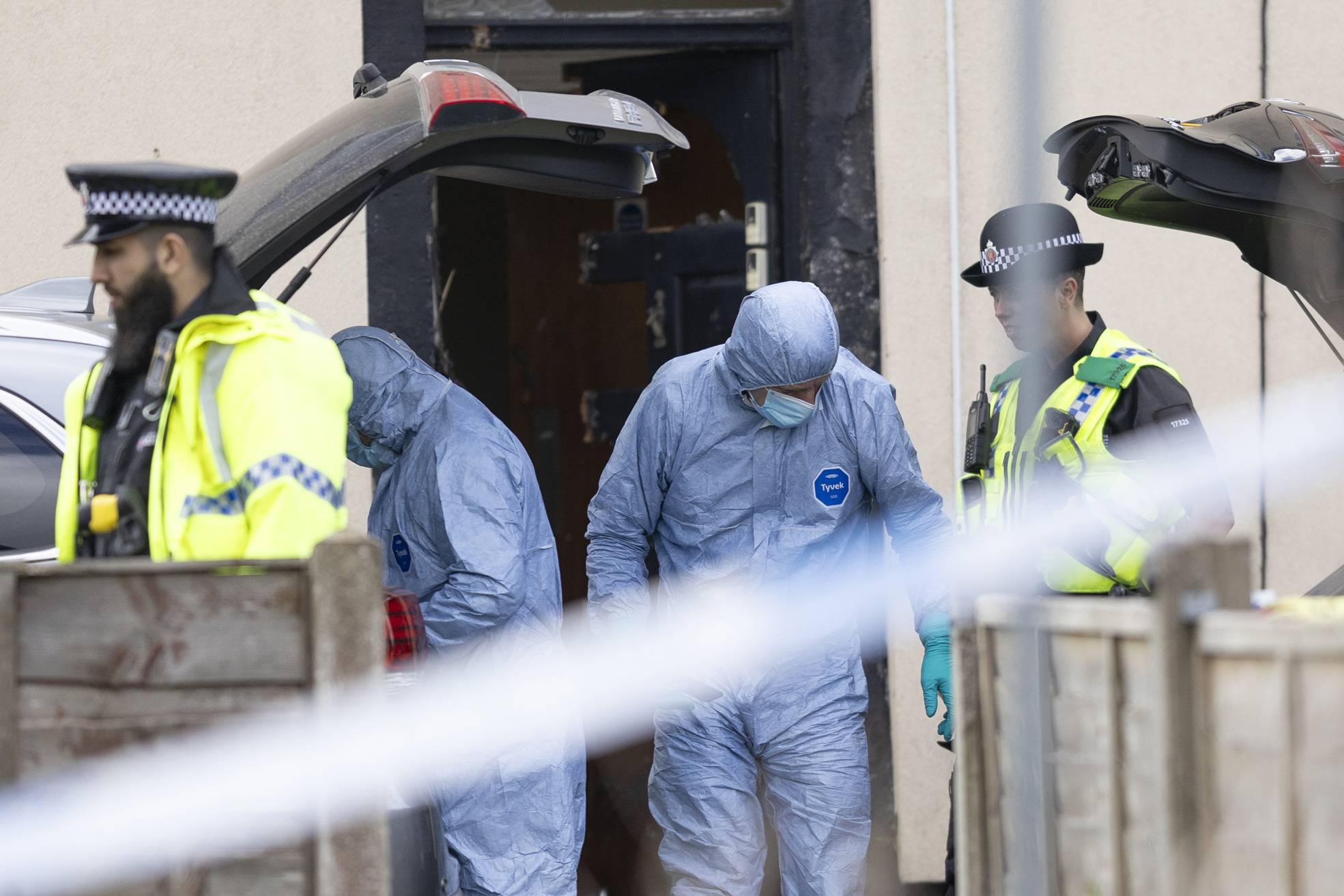 ضباط أدلة جنائية في الشرطة البريطانية خلال عملية اعتقالِ إيراني بأحد منازل بلدة روتشديل قرب مانشستر خلال مايو الماضي (غيتي)