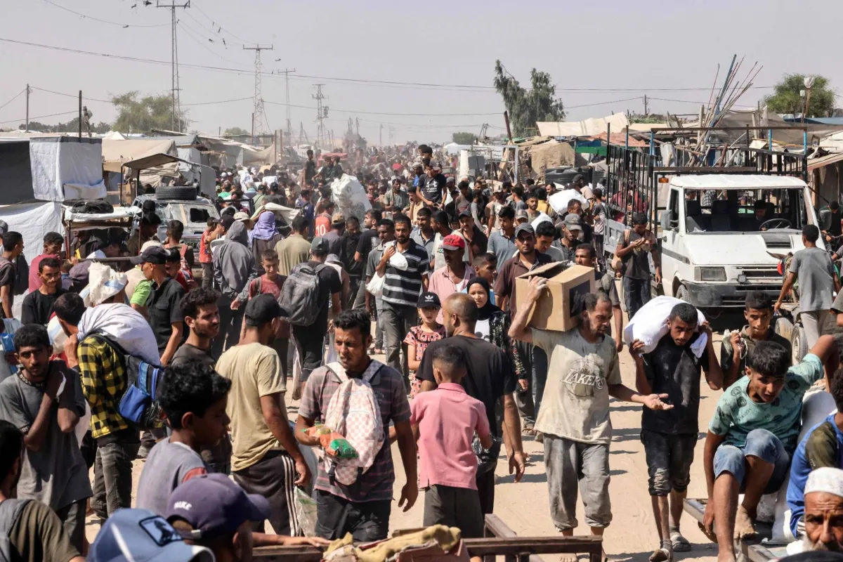 فلسطينيون يحملون طروداً غذائية بمخيم المواصي في رفح جنوب قطاع غزة (أ.ف.ب)