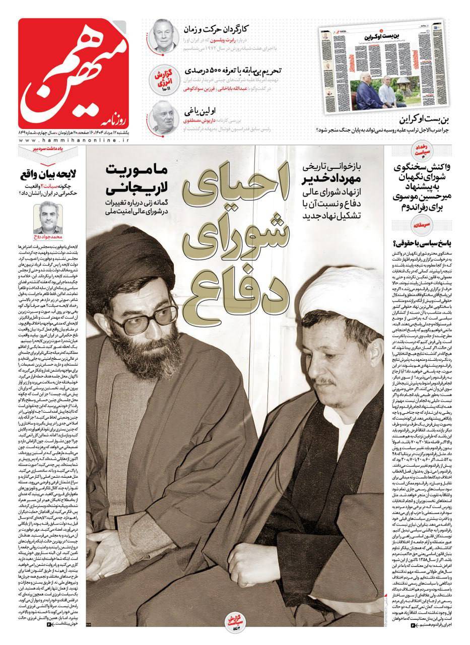 وصرح النائب السابق منصور حقيقت بور، وهو أحد مستشاري لاريجاني: «بعد الحرب، أعيد تشكيل المجلس الأعلى للدفاع. أما فيما يخص تركيبته، فلا بد أن ننتظر لنرى كيف سيشكلها المرشد».