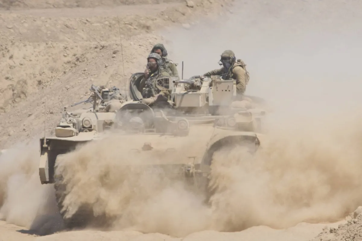 جنود إسرائيليون يعودون بمركبة مدرعة من شمال قطاع غزة إلى جنوب إسرائيل 29 يوليو 2025 (أ.ب)