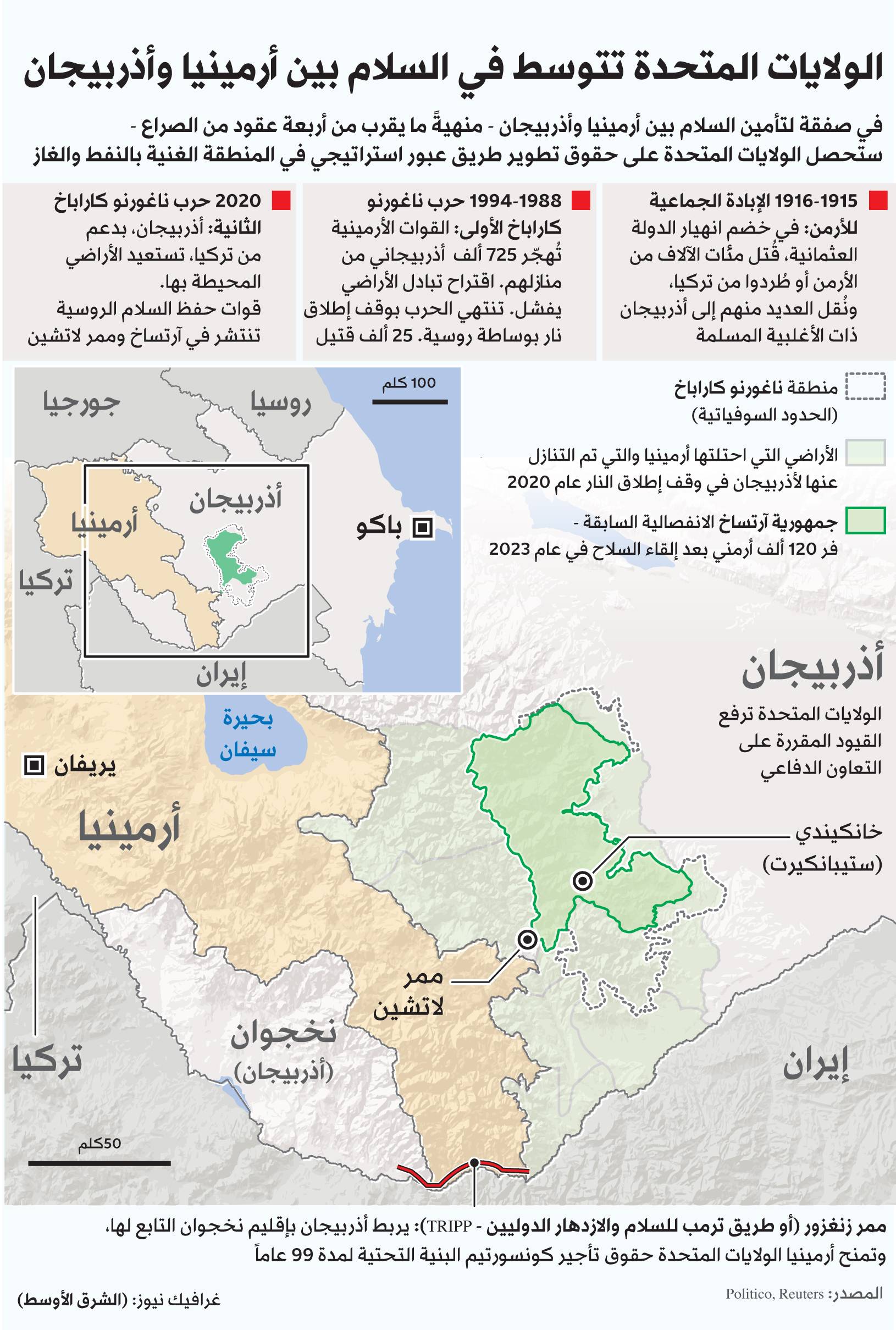 وفي يوليو (تموز)، برز تطور مهم عندما أعلن السفير الأميركي لدى تركيا استعداد الولايات المتحدة لاستئجار «ممر زانغيزور» لمدة 100 عام، في مبادرة جاءت من تركيا على ما يبدو، مع احتمال أن تتولى شركة أميركية خاصة ضمان تنفيذ المشروع. ولاحقاً، نفت أرمينيا وجود أي خطط لنقل السيطرة على الممر إلى الولايات المتحدة، وأكدت السكرتيرة الصحافية لرئيس الوزراء، نازلي باغداساريان، أن «أرمينيا لم تناقش ولن تناقش نقل السيطرة على أراضيها السيادية إلى طرف ثالث».