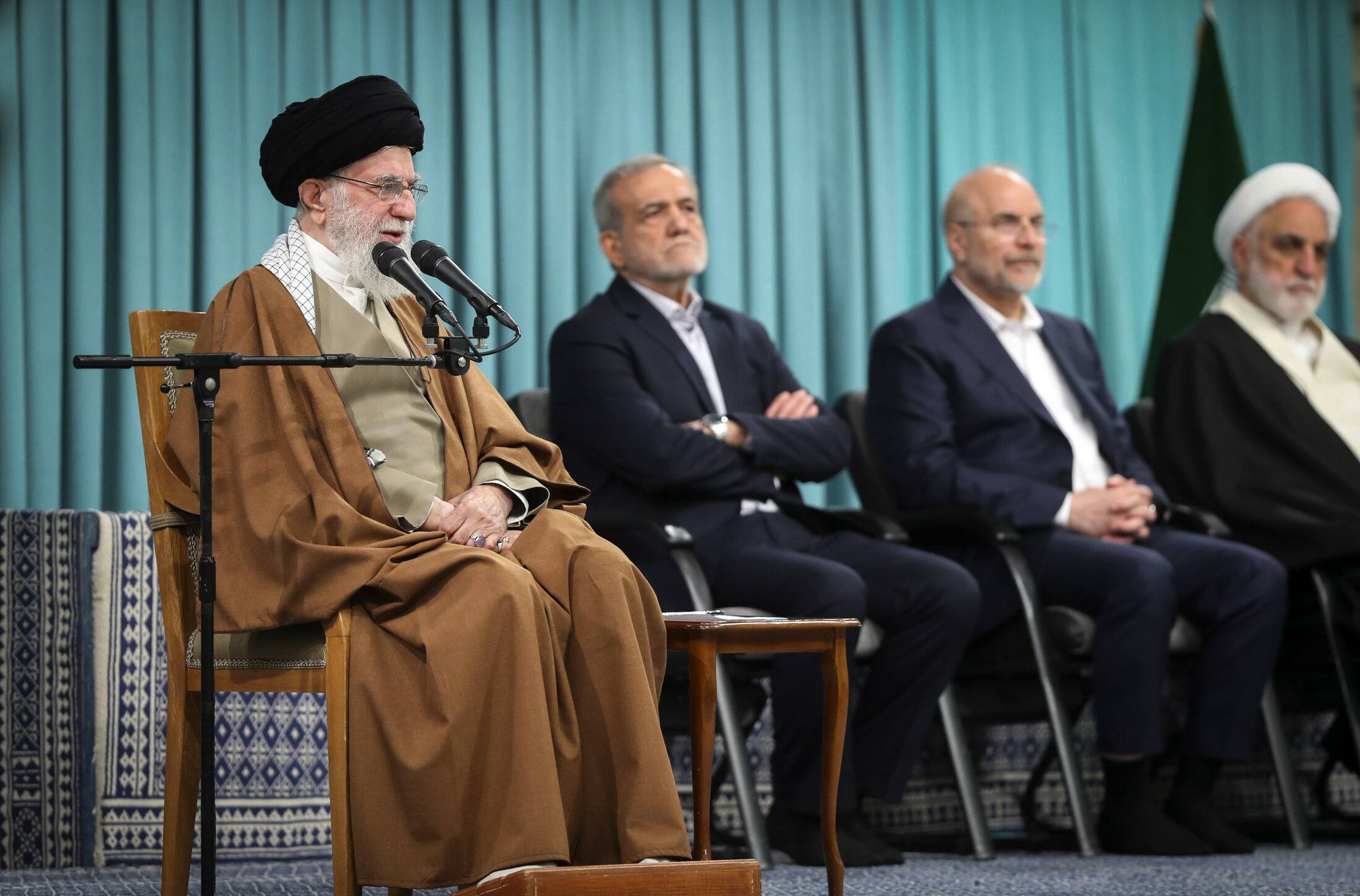 المرشد الإيراني يلتقي مع مسؤولين ويبدو خلفه بزشكيان ورئيس البرلمان محمد باقر قاليباف ورئيس القضاء غلام حسين محسني إجئي (أ.ب)