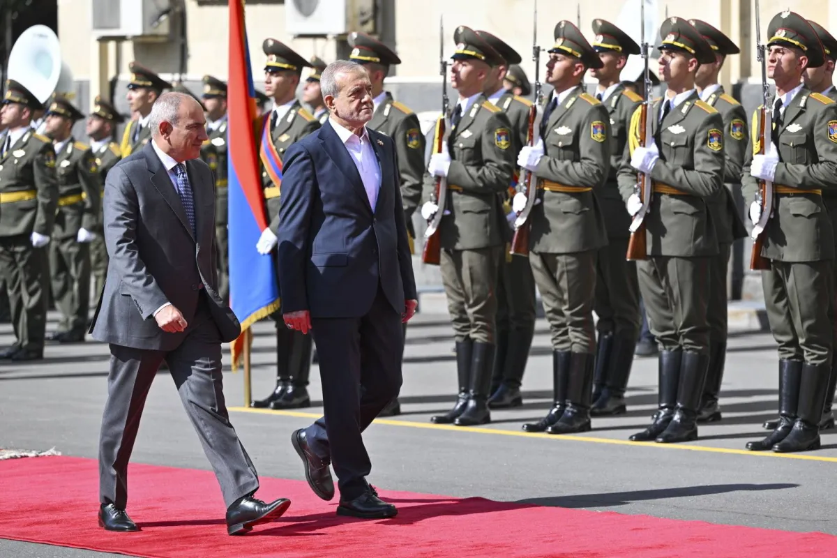 ووصل بزشكيان، الاثنين، على رأس وفد رفيع إلى يريفان بعد عشرة أيام من توقيع أذربيجان وأرمينيا اتفاقيات، واستضاف رئيس وزراء أرمينيا نيكول باشينيان، صباح الثلاثاء، في مقره مراسم استقبال رسمية، قبل إجراء محادثات ثنائية، أسفرت عن توقيع 10 مذكرات تعاون بين البلدين.