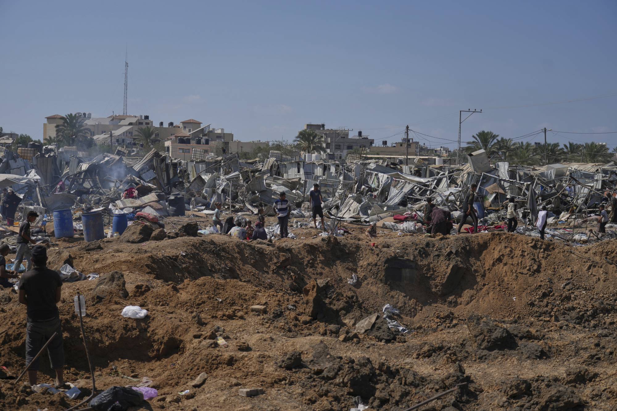 فلسطينيون على حافة هوة خلَّفتها ضربات إسرائيلية لمنطقة مخيمات نازحين في دير البلح يوم الخميس (أ.ب)